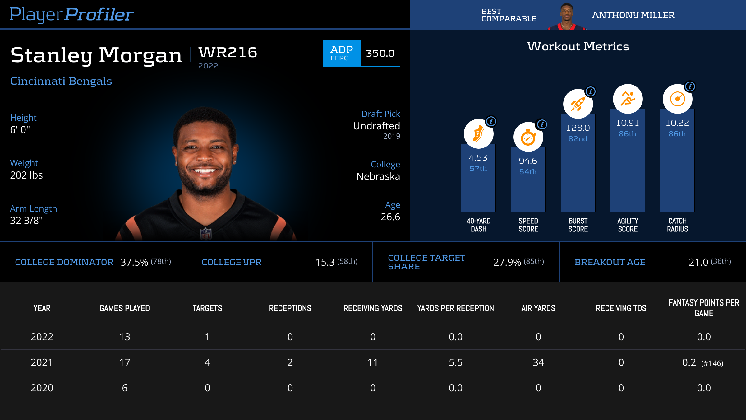 Box score statistics such as targets, yards, touchdowns, and fantasy points per target are updated the next day. Advanced stats and metrics are updated later in the week during the NFL season.