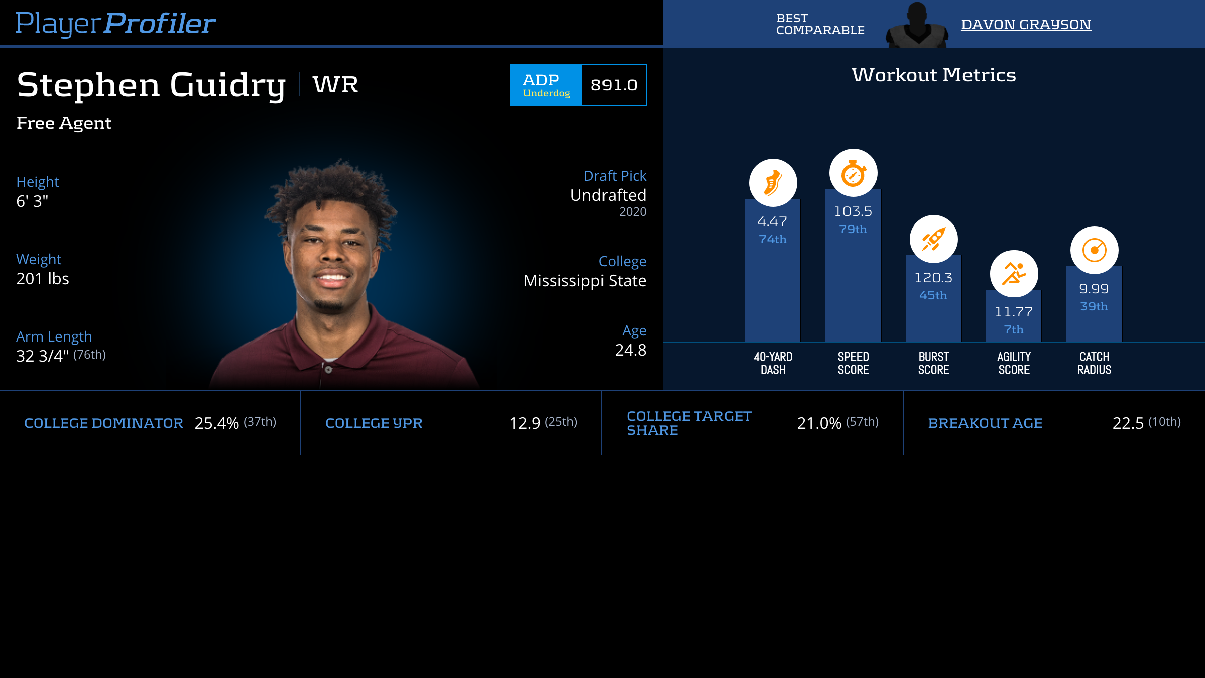 | Year Year | Games Games | Receptions Recs | Receiving Yards Rec Yds | Target Share Tgt Share | Catch Rate Catch Rate | Receiving Touchdowns Rec TDs | Special Teams Yards Special Teams | Age Age | School School |