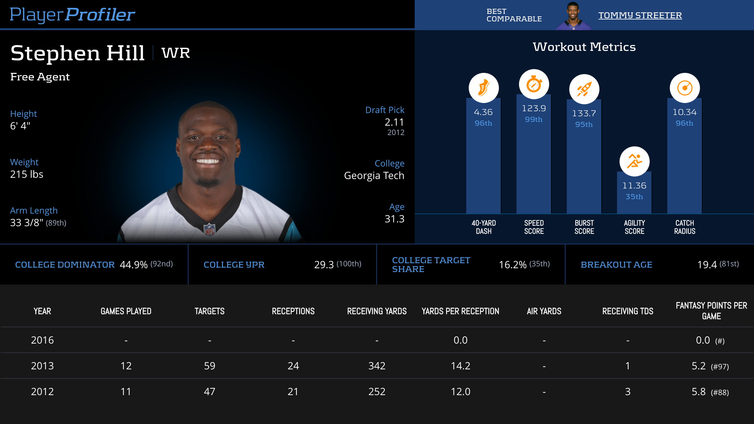 | Year Year | Games Games | Receptions Recs | Receiving Yards Rec Yds | Target Share Tgt Share | Catch Rate Catch Rate | Receiving Touchdowns Rec TDs | Special Teams Yards Special Teams | Age Age | School School |
