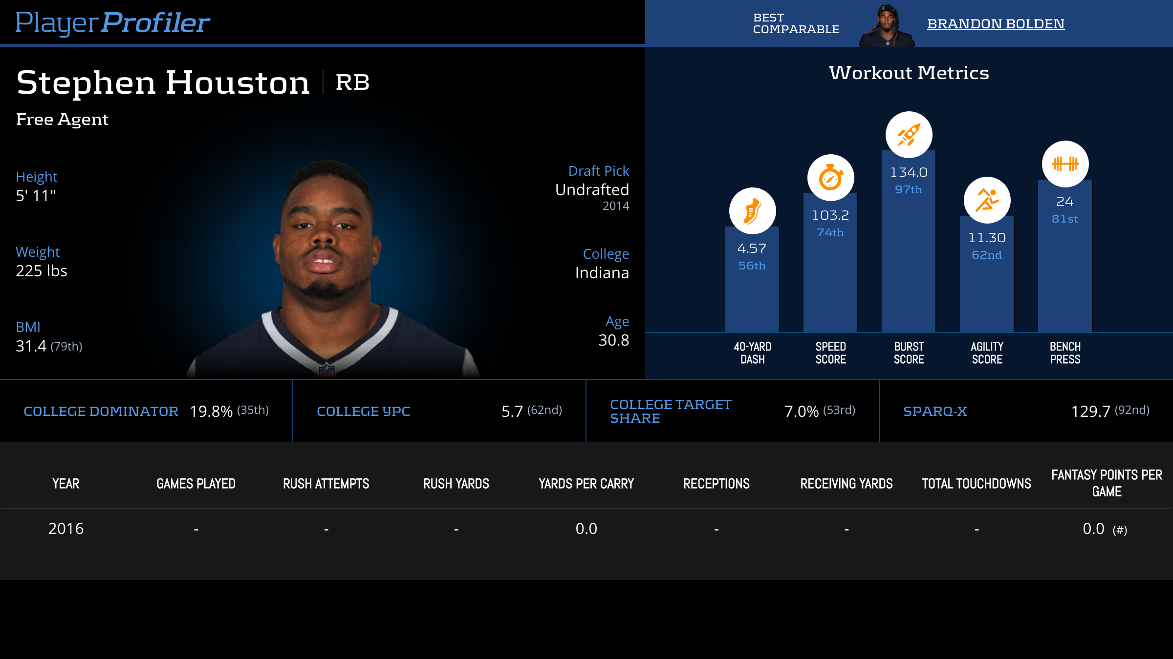 | Year Year | Games Games | Rush Attempts Rush Atts | Rushing Yards Rush Yrds | Total Touchdowns TDs | Receptions Rec | Receiving Yards Rec Yrds | Target Share Tgt Share | Age Age | School School |