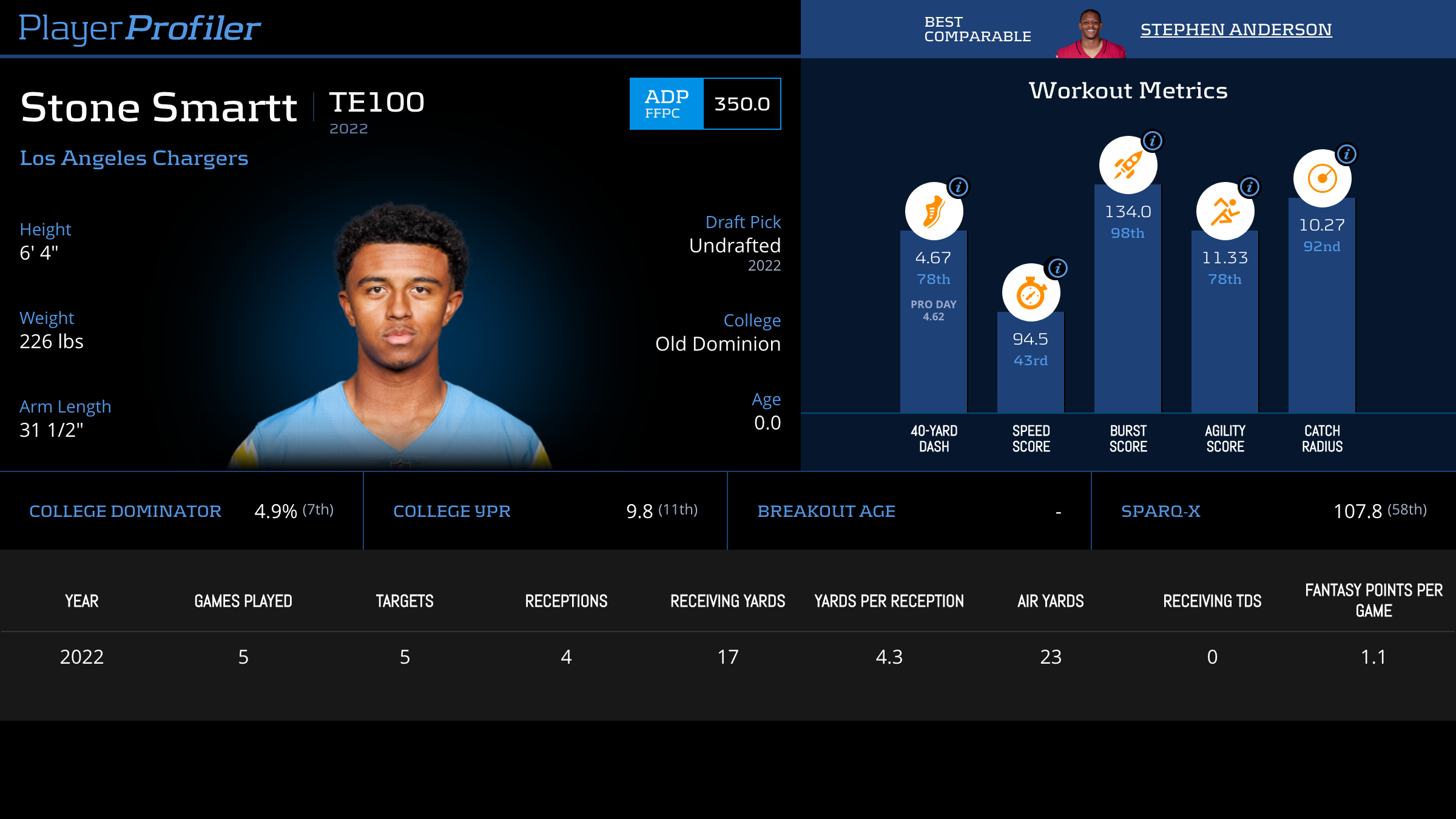 | Year Year | Games Games | Receptions Recs | Receiving Yards Rec Yds | Target Share Tgt Share | Catch Rate Catch Rate | Receiving Touchdowns Rec TDs | Special Teams Yards Special Teams | Age Age | School School |