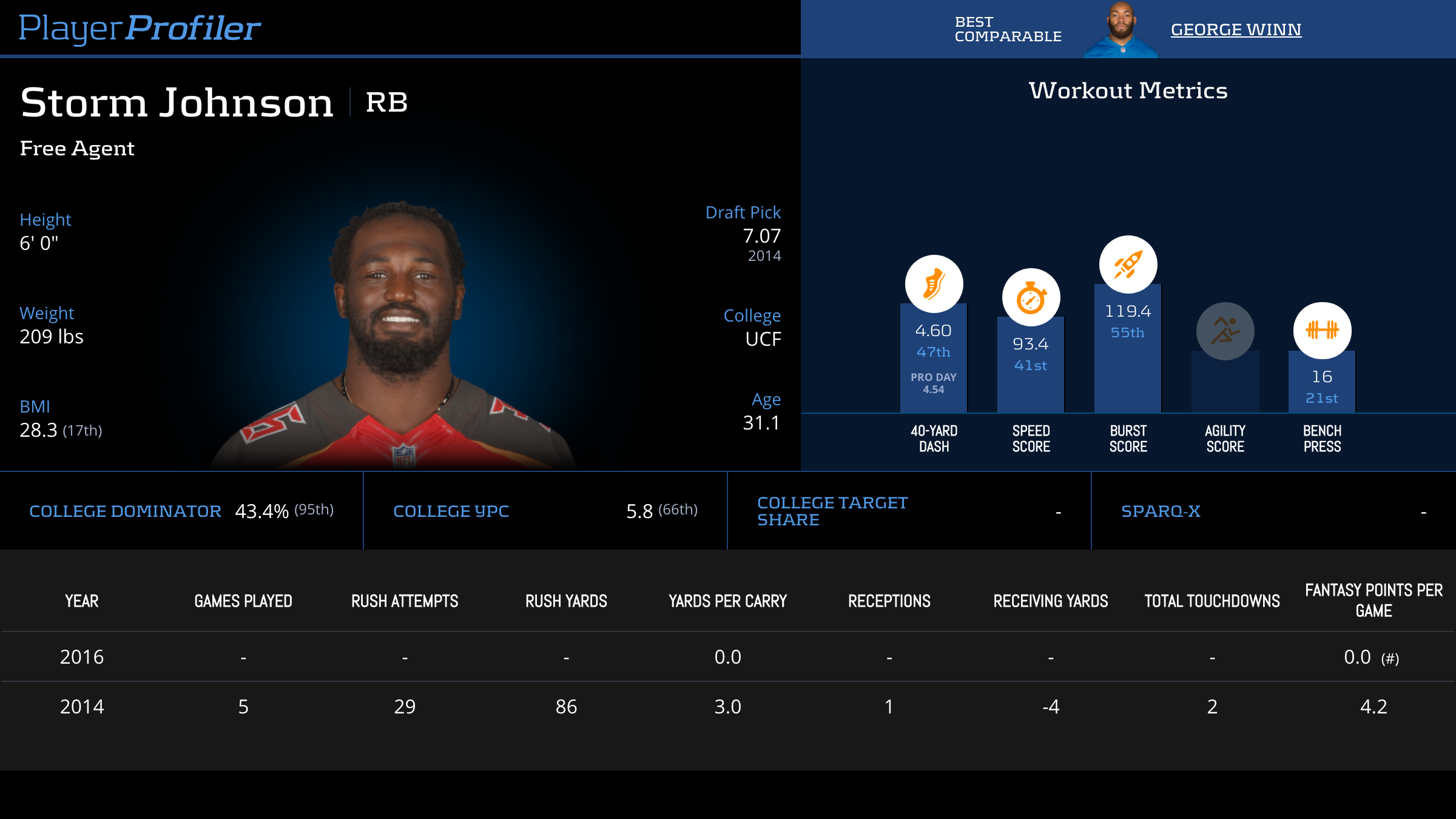 | Year Year | Games Games | Rush Attempts Rush Atts | Rushing Yards Rush Yrds | Total Touchdowns TDs | Receptions Rec | Receiving Yards Rec Yrds | Target Share Tgt Share | Age Age | School School |