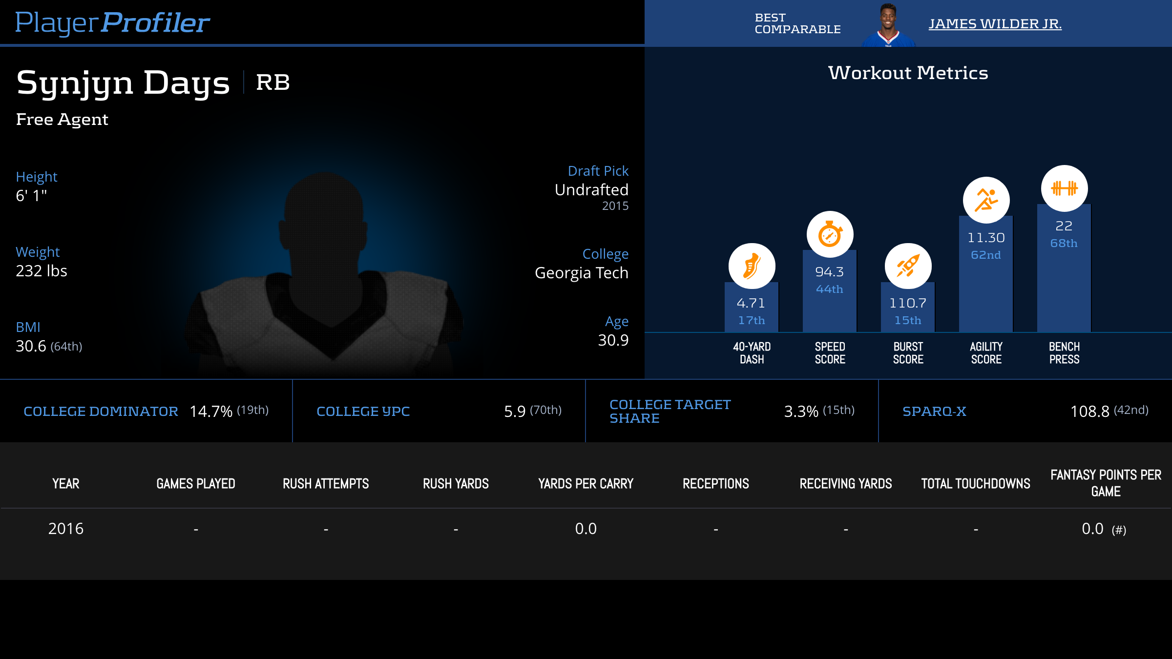 | Year Year | Games Games | Rush Attempts Rush Atts | Rushing Yards Rush Yrds | Total Touchdowns TDs | Receptions Rec | Receiving Yards Rec Yrds | Target Share Tgt Share | Age Age | School School |