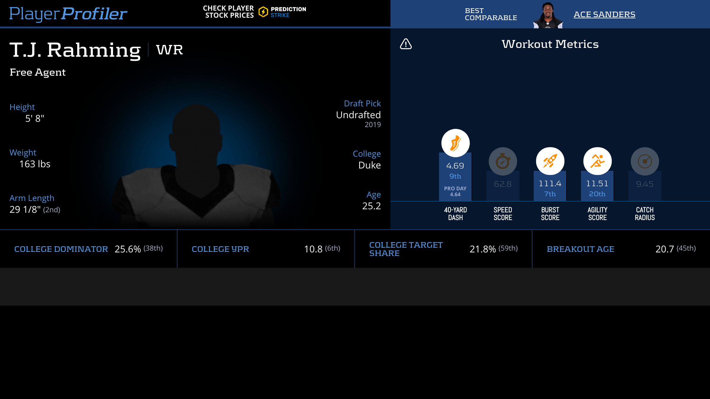 | Year Year | Games Games | Receptions Recs | Receiving Yards Rec Yds | Target Share Tgt Share | Catch Rate Catch Rate | Receiving Touchdowns Rec TDs | Special Teams Yards Special Teams | Age Age | School School |