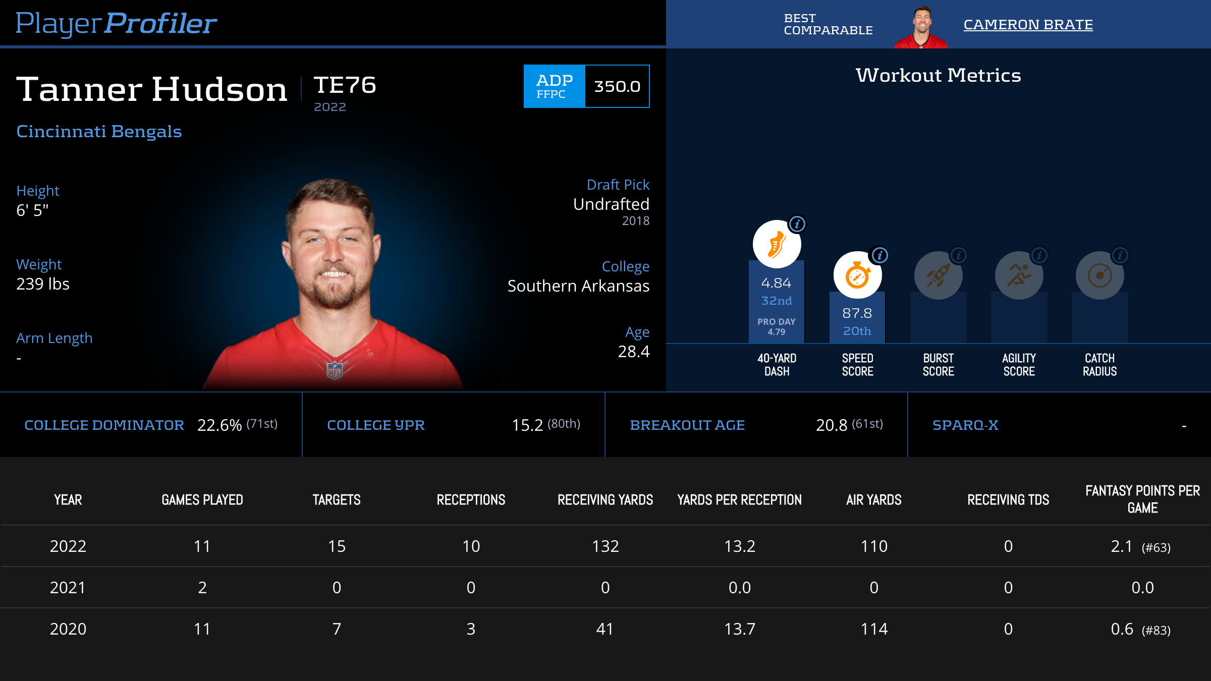 Box score statistics such as targets, yards, touchdowns, and fantasy points per target are updated the next day. Advanced stats and metrics are updated later in the week during the NFL season.