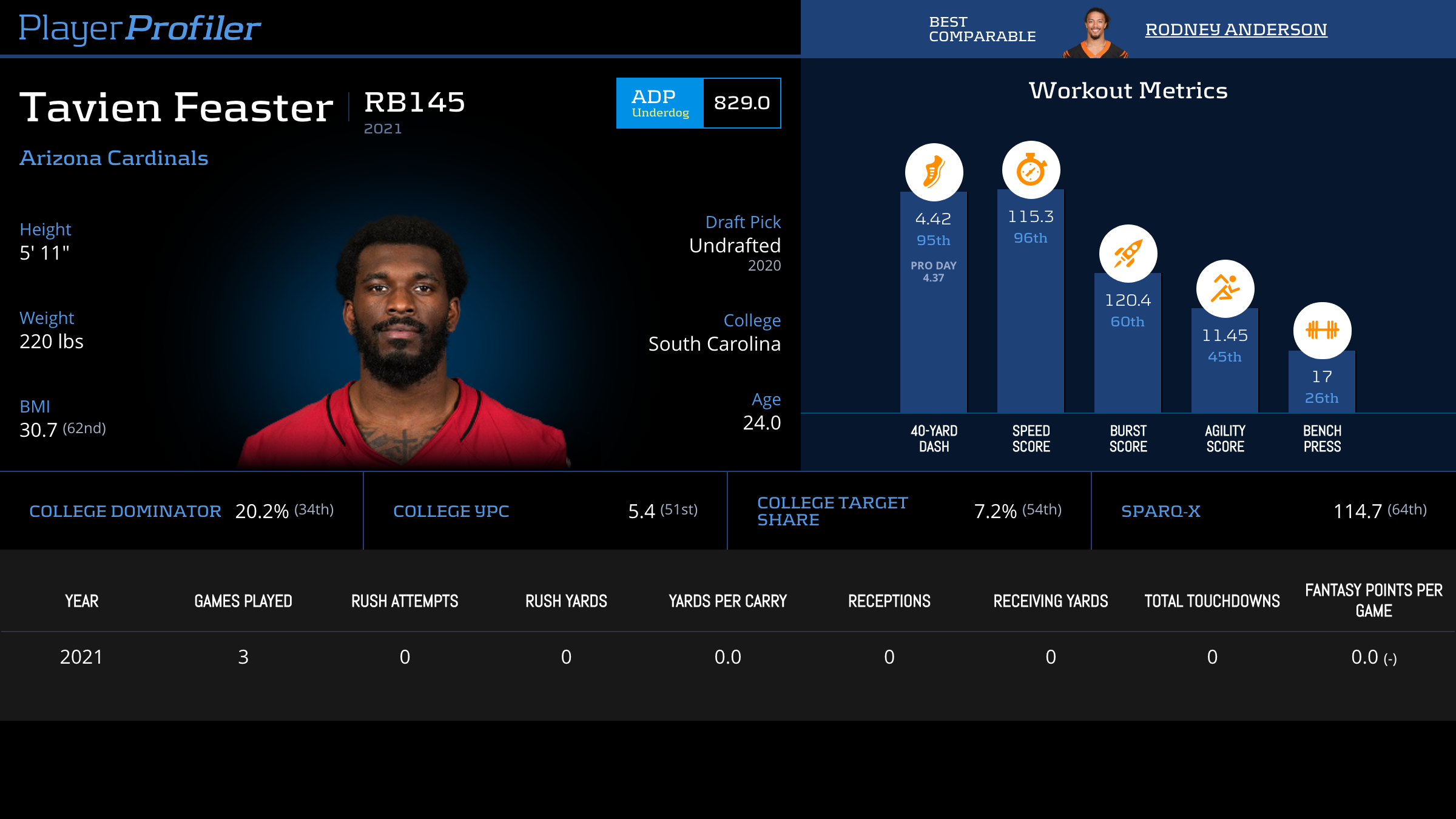 | Year Year | Games Games | Rush Attempts Rush Atts | Rushing Yards Rush Yrds | Total Touchdowns TDs | Receptions Rec | Receiving Yards Rec Yrds | Target Share Tgt Share | Age Age | School School |