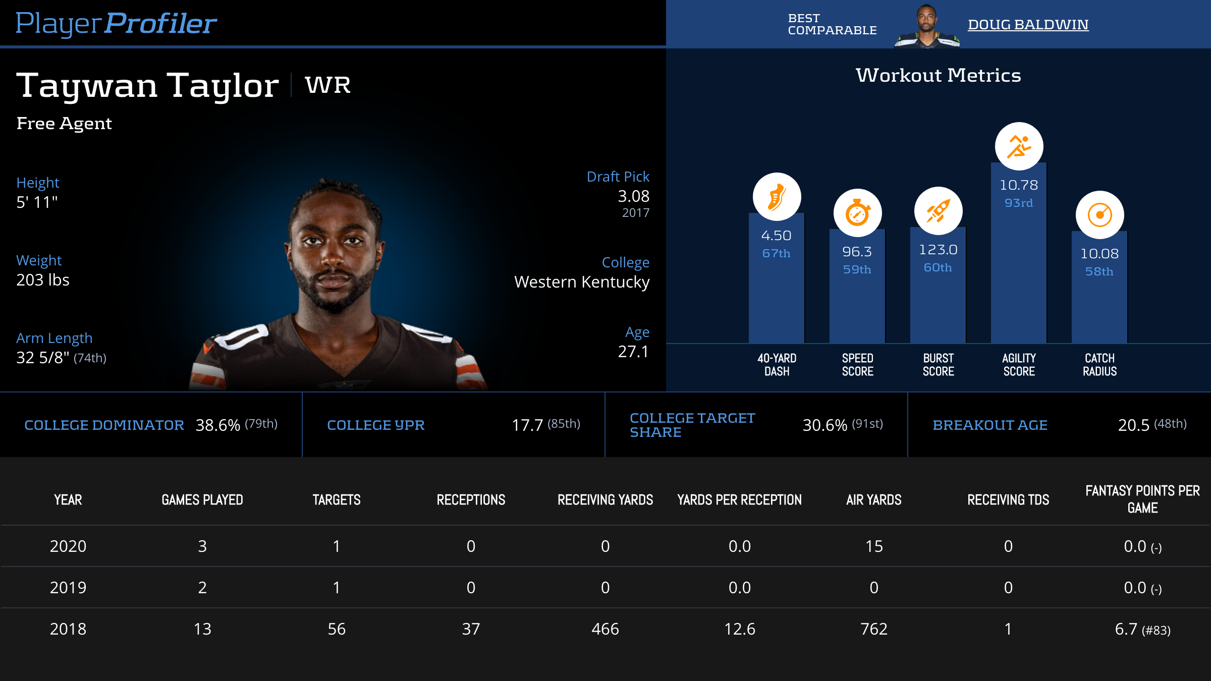 | Year Year | Games Games | Receptions Recs | Receiving Yards Rec Yds | Target Share Tgt Share | Catch Rate Catch Rate | Receiving Touchdowns Rec TDs | Special Teams Yards Special Teams | Age Age | School School |