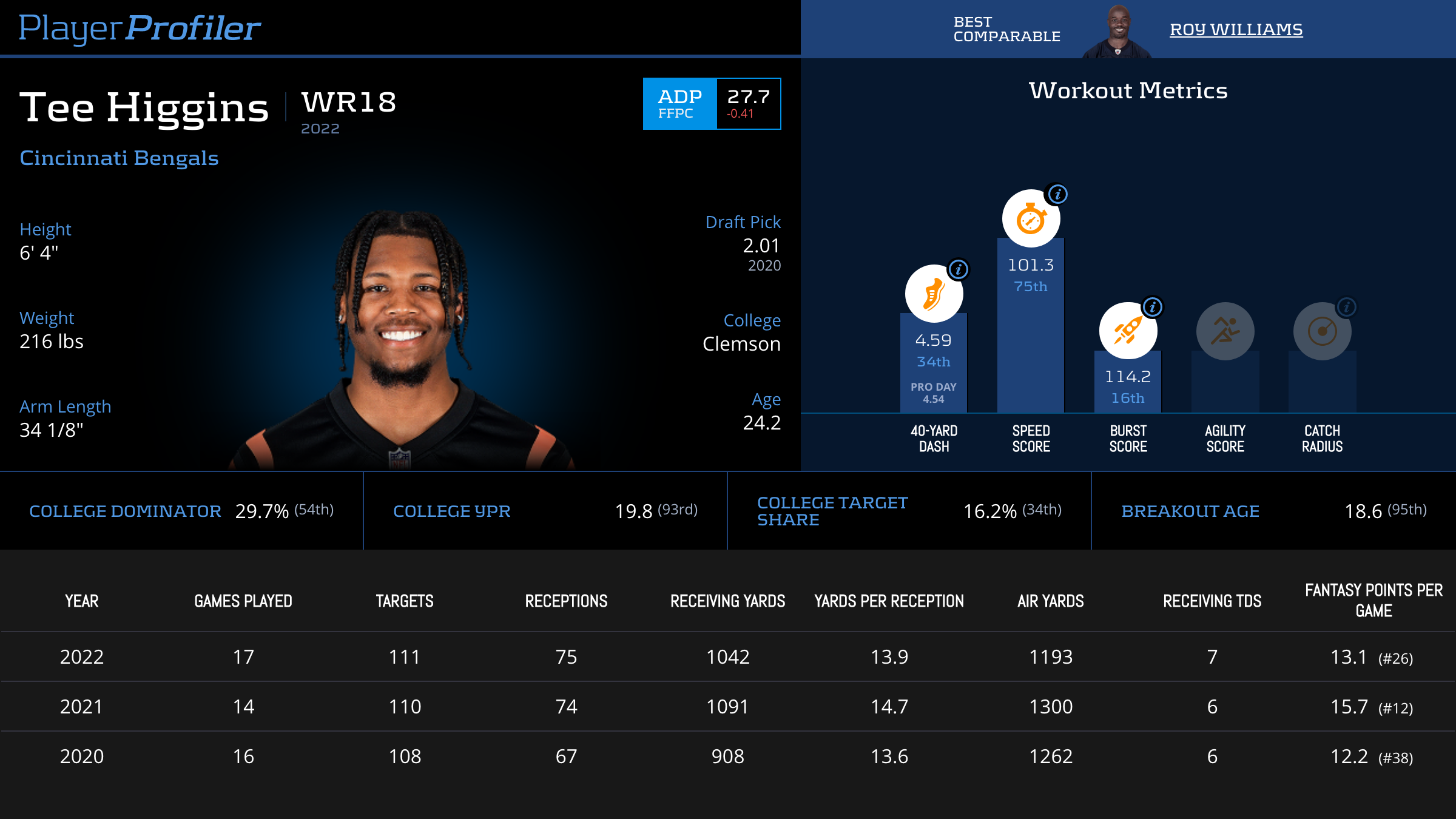 Box score statistics such as targets, yards, touchdowns, and fantasy points per target are updated the next day. Advanced stats and metrics are updated later in the week during the NFL season.