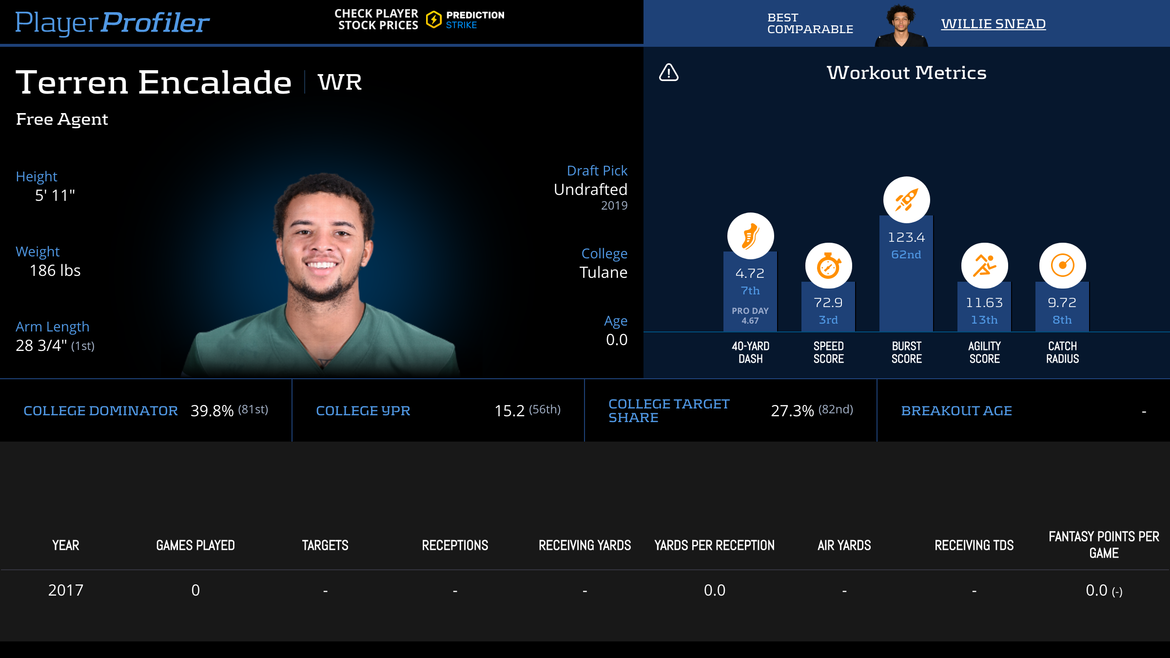 | Year Year | Games Games | Receptions Recs | Receiving Yards Rec Yds | Target Share Tgt Share | Catch Rate Catch Rate | Receiving Touchdowns Rec TDs | Special Teams Yards Special Teams | Age Age | School School |