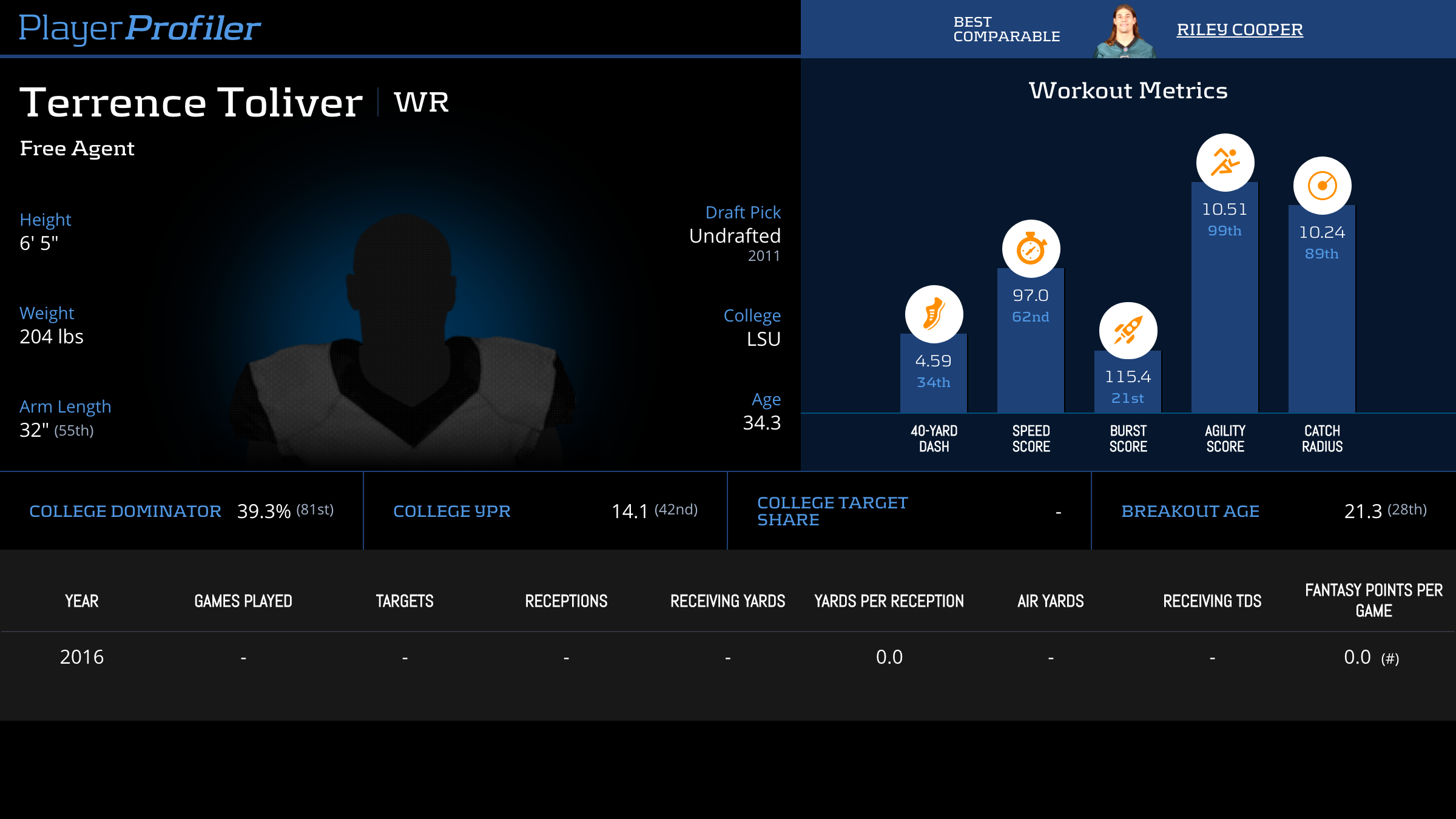 | Year Year | Games Games | Receptions Recs | Receiving Yards Rec Yds | Target Share Tgt Share | Catch Rate Catch Rate | Receiving Touchdowns Rec TDs | Special Teams Yards Special Teams | Age Age | School School |