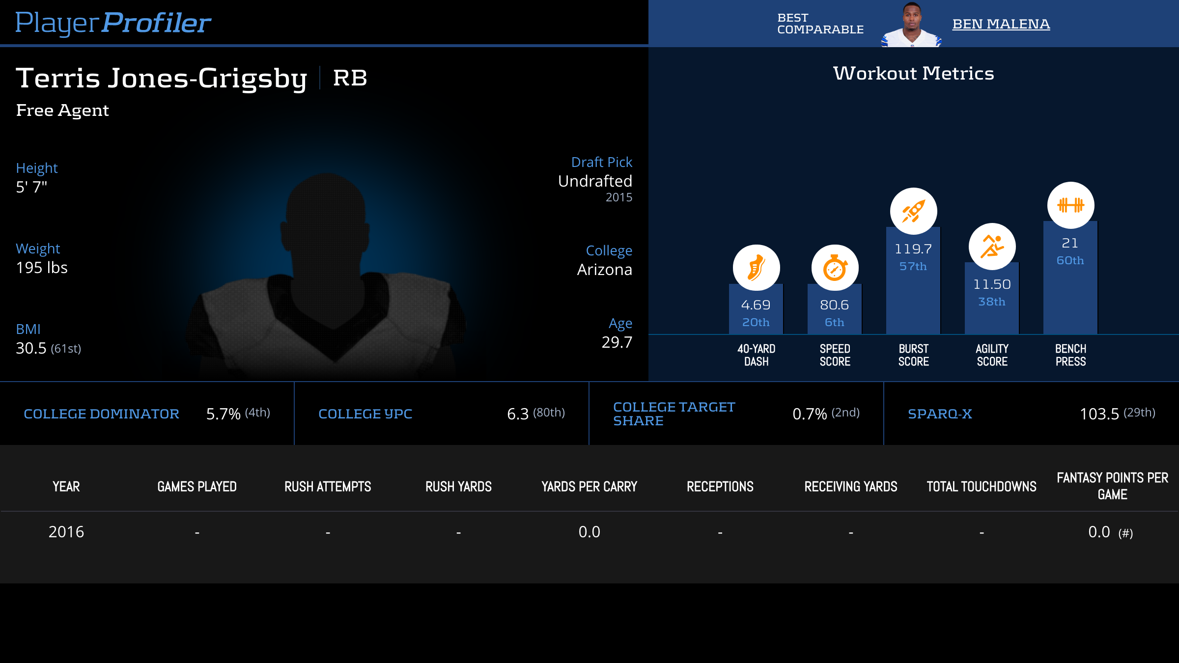 | Year Year | Games Games | Rush Attempts Rush Atts | Rushing Yards Rush Yrds | Total Touchdowns TDs | Receptions Rec | Receiving Yards Rec Yrds | Target Share Tgt Share | Age Age | School School |