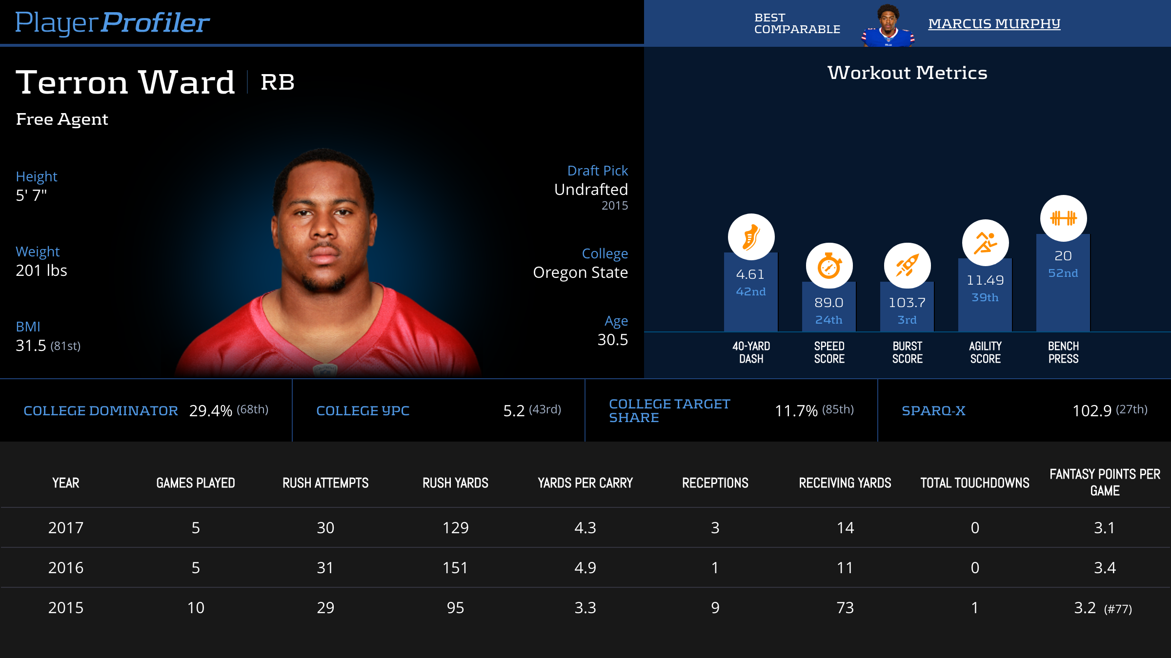 | Year Year | Games Games | Rush Attempts Rush Atts | Rushing Yards Rush Yrds | Total Touchdowns TDs | Receptions Rec | Receiving Yards Rec Yrds | Target Share Tgt Share | Age Age | School School |