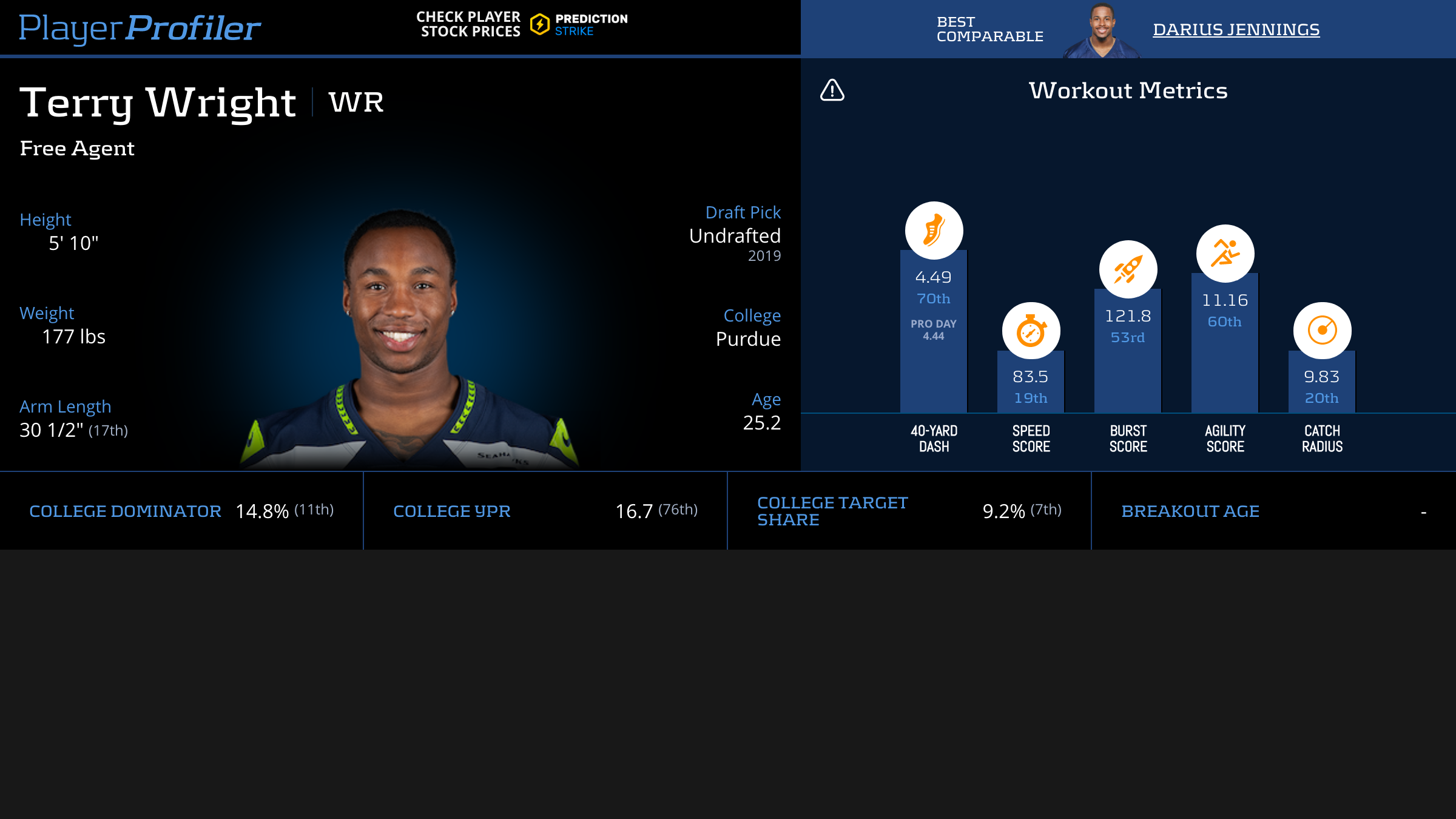 | Year Year | Games Games | Receptions Recs | Receiving Yards Rec Yds | Target Share Tgt Share | Catch Rate Catch Rate | Receiving Touchdowns Rec TDs | Special Teams Yards Special Teams | Age Age | School School |