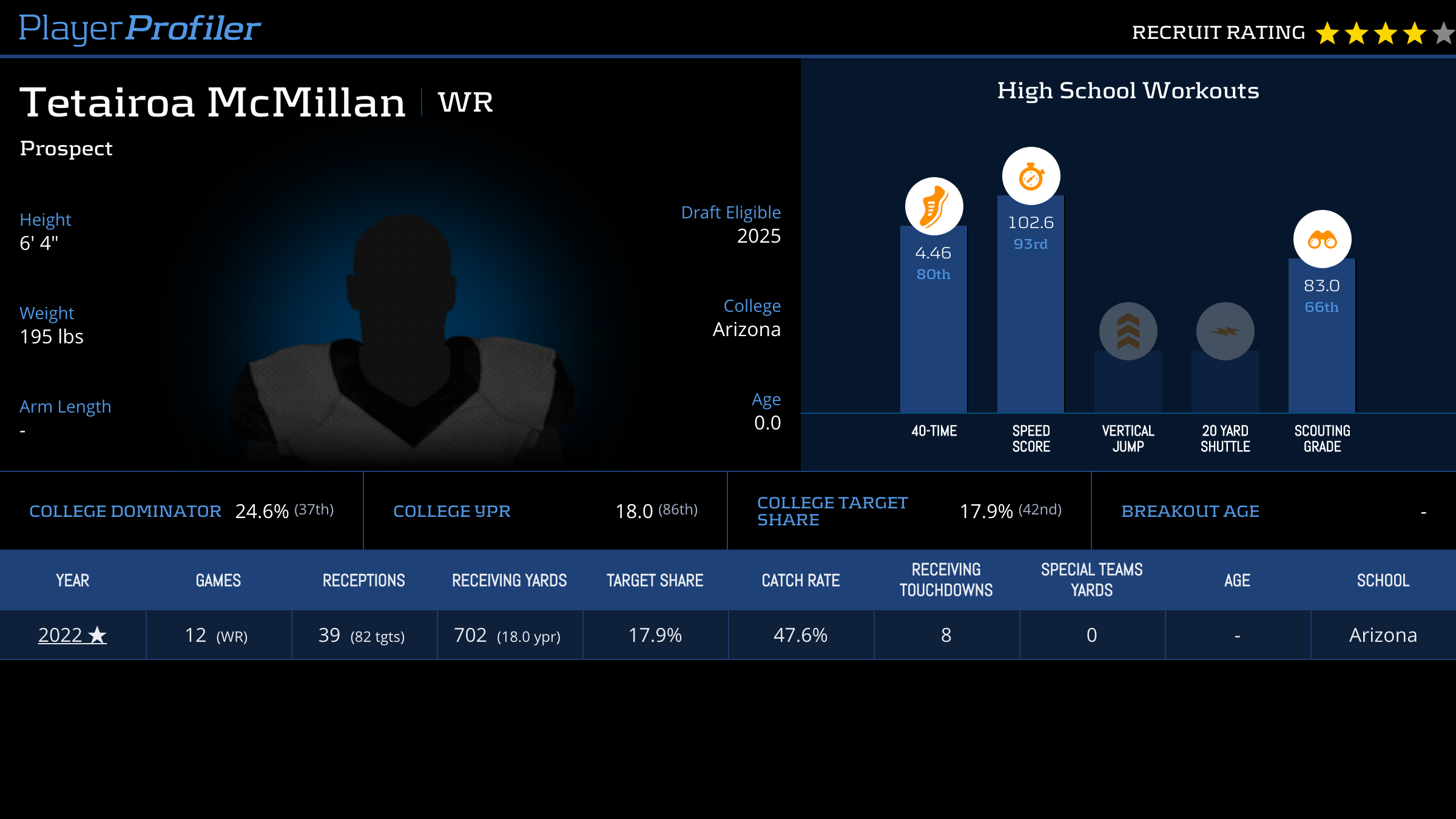 | Year Year | Games Games | Receptions Recs | Receiving Yards Rec Yds | Target Share Tgt Share | Catch Rate Catch Rate | Receiving Touchdowns Rec TDs | Special Teams Yards Special Teams | Age Age | School School |