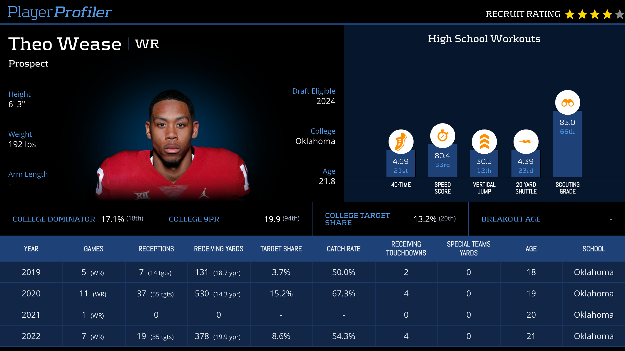 | Year Year | Games Games | Receptions Recs | Receiving Yards Rec Yds | Target Share Tgt Share | Catch Rate Catch Rate | Receiving Touchdowns Rec TDs | Special Teams Yards Special Teams | Age Age | School School |