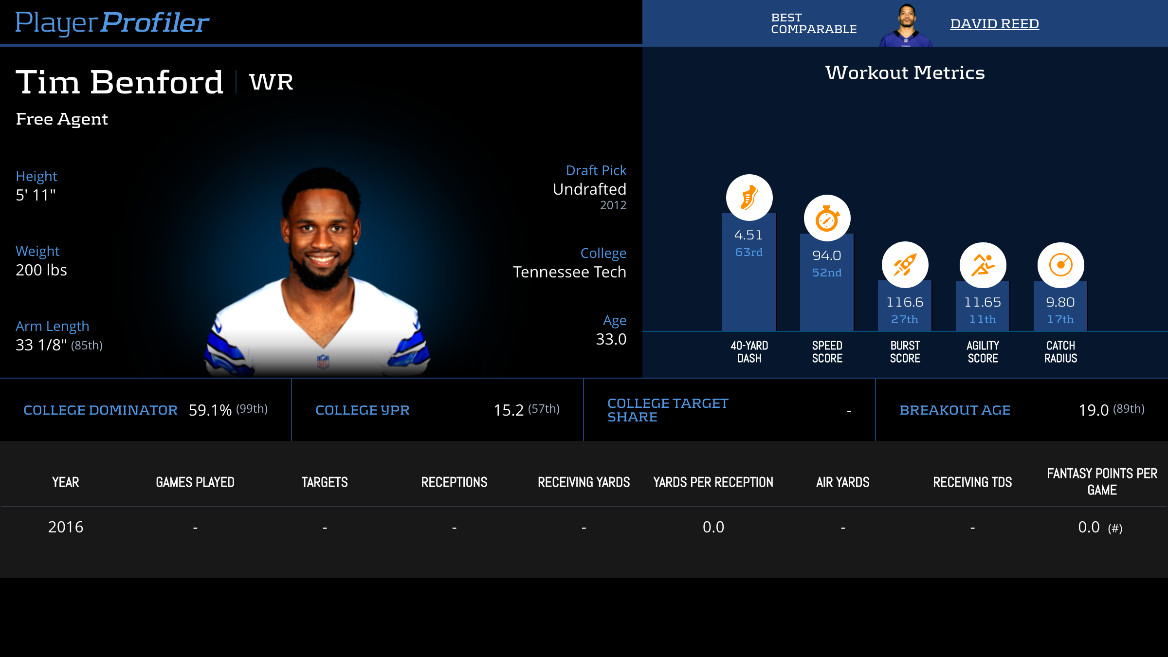 Year Games Tgts Rec Rec Yds YPR Air Yds Rec TD Fantasy Pts/Game