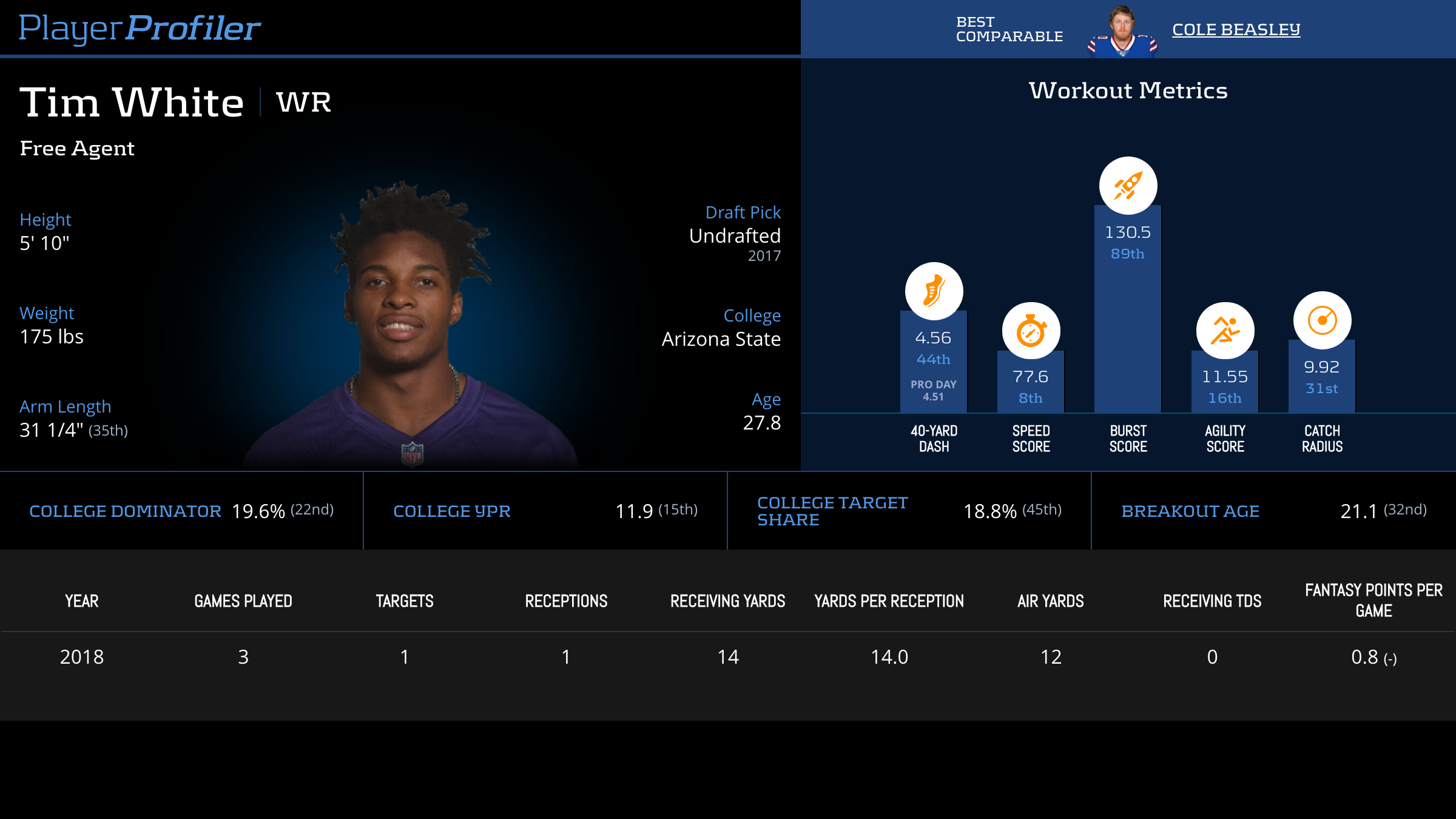 | Year Year | Games Games | Receptions Recs | Receiving Yards Rec Yds | Target Share Tgt Share | Catch Rate Catch Rate | Receiving Touchdowns Rec TDs | Special Teams Yards Special Teams | Age Age | School School |