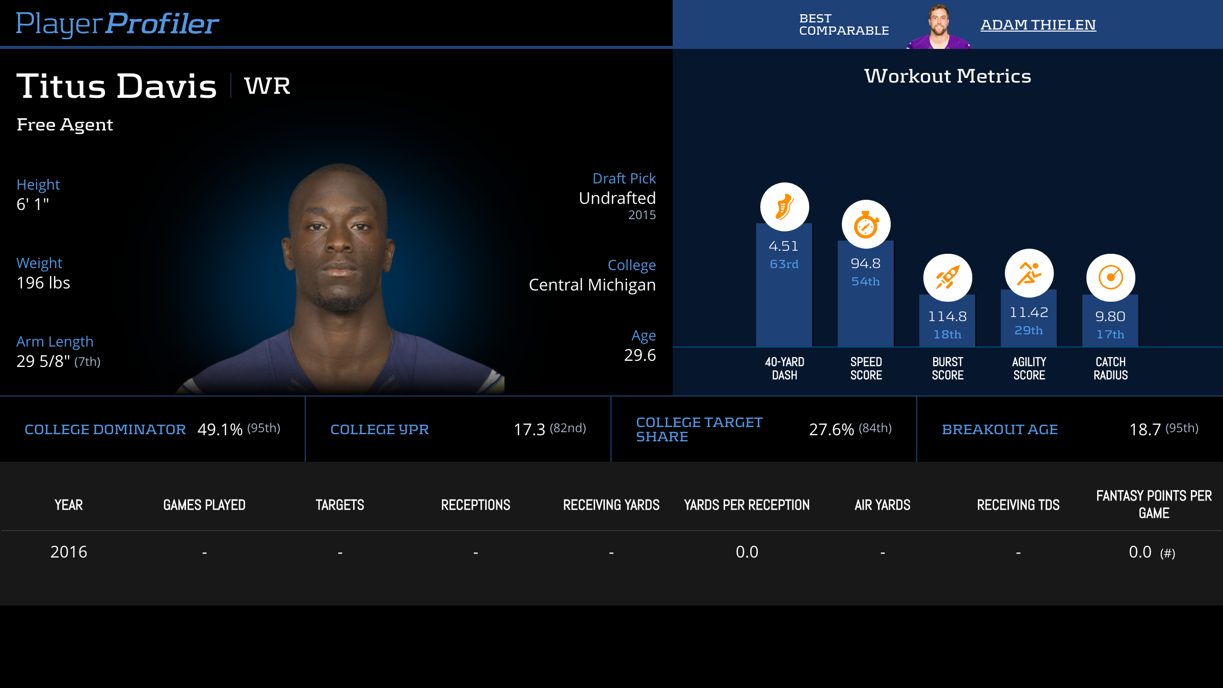 | Year Year | Games Games | Receptions Recs | Receiving Yards Rec Yds | Target Share Tgt Share | Catch Rate Catch Rate | Receiving Touchdowns Rec TDs | Special Teams Yards Special Teams | Age Age | School School |