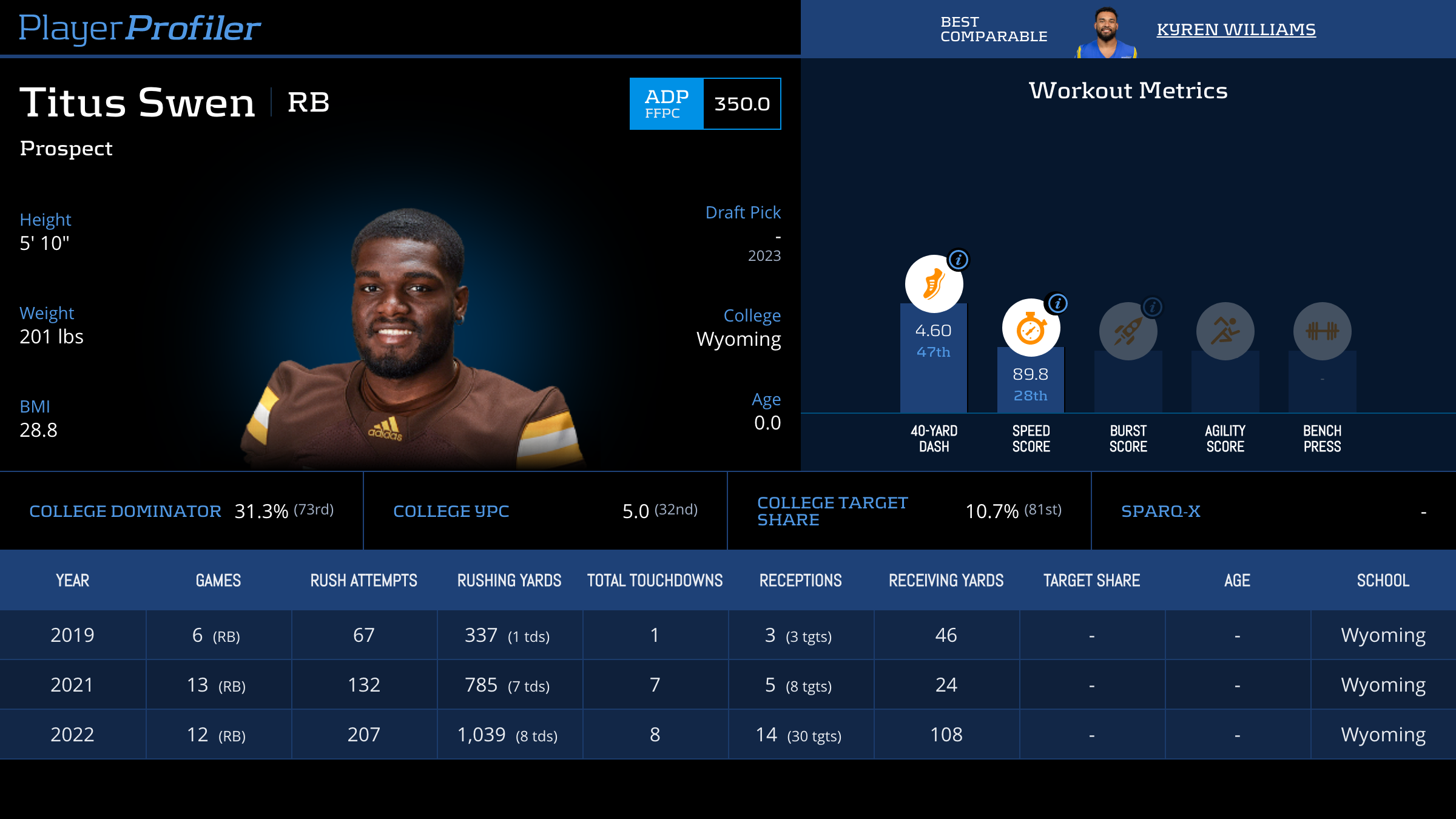 | Year Year | Games Games | Rush Attempts Rush Atts | Rushing Yards Rush Yrds | Total Touchdowns TDs | Receptions Rec | Receiving Yards Rec Yrds | Target Share Tgt Share | Age Age | School School |