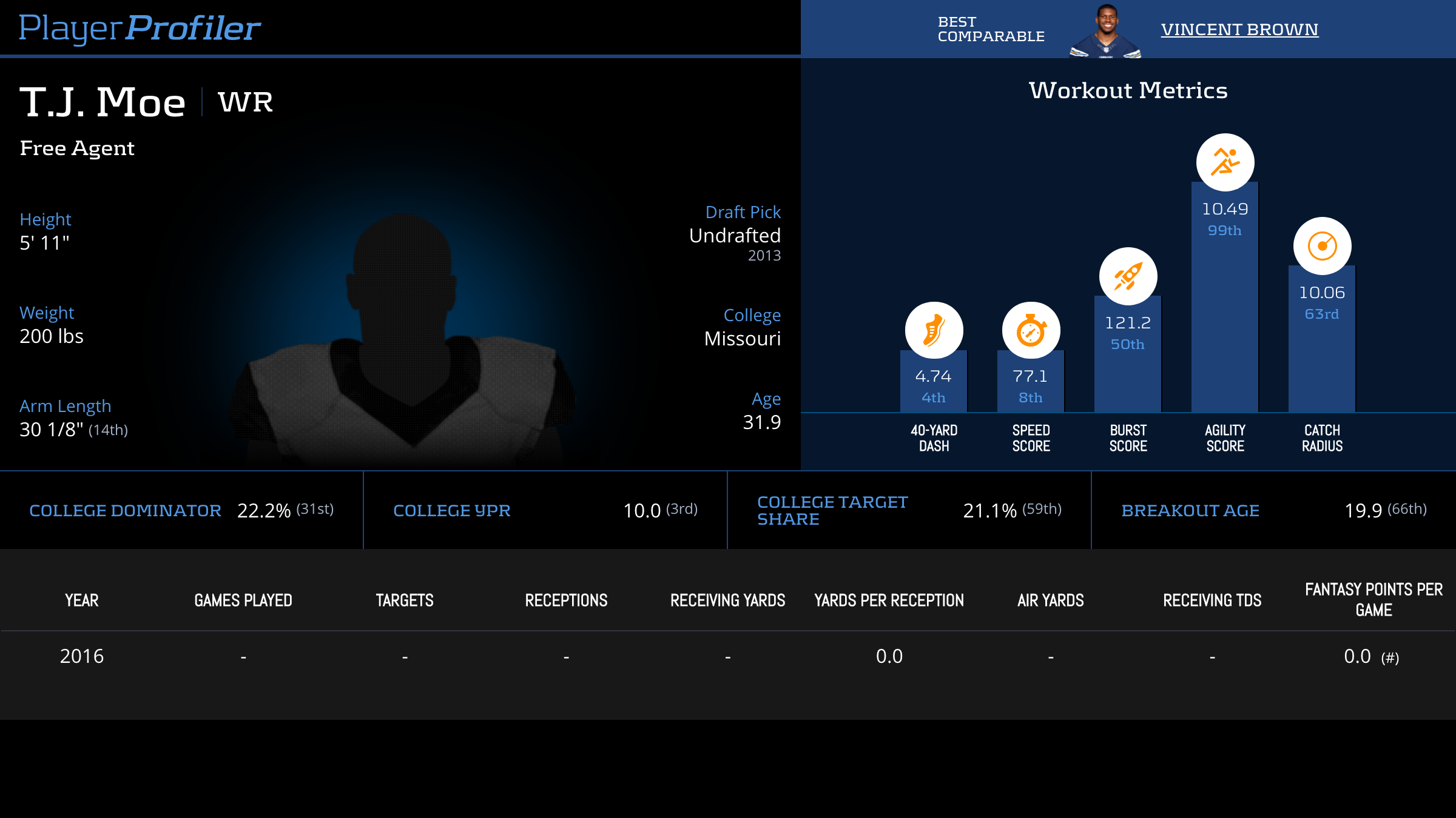 | Year Year | Games Games | Receptions Recs | Receiving Yards Rec Yds | Target Share Tgt Share | Catch Rate Catch Rate | Receiving Touchdowns Rec TDs | Special Teams Yards Special Teams | Age Age | School School |