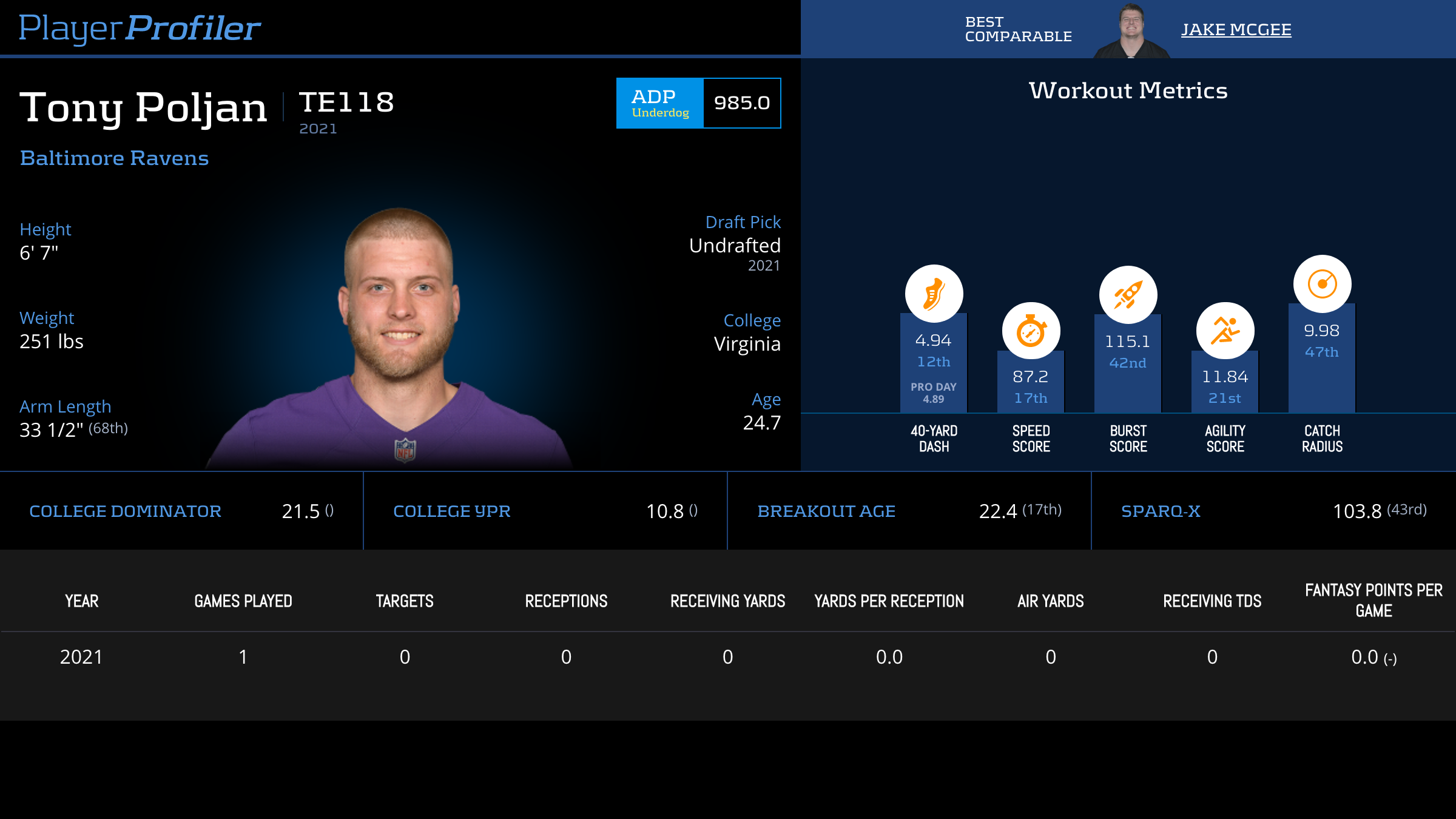 | Year Year | Games Games | Receptions Recs | Receiving Yards Rec Yds | Target Share Tgt Share | Catch Rate Catch Rate | Receiving Touchdowns Rec TDs | Special Teams Yards Special Teams | Age Age | School School |