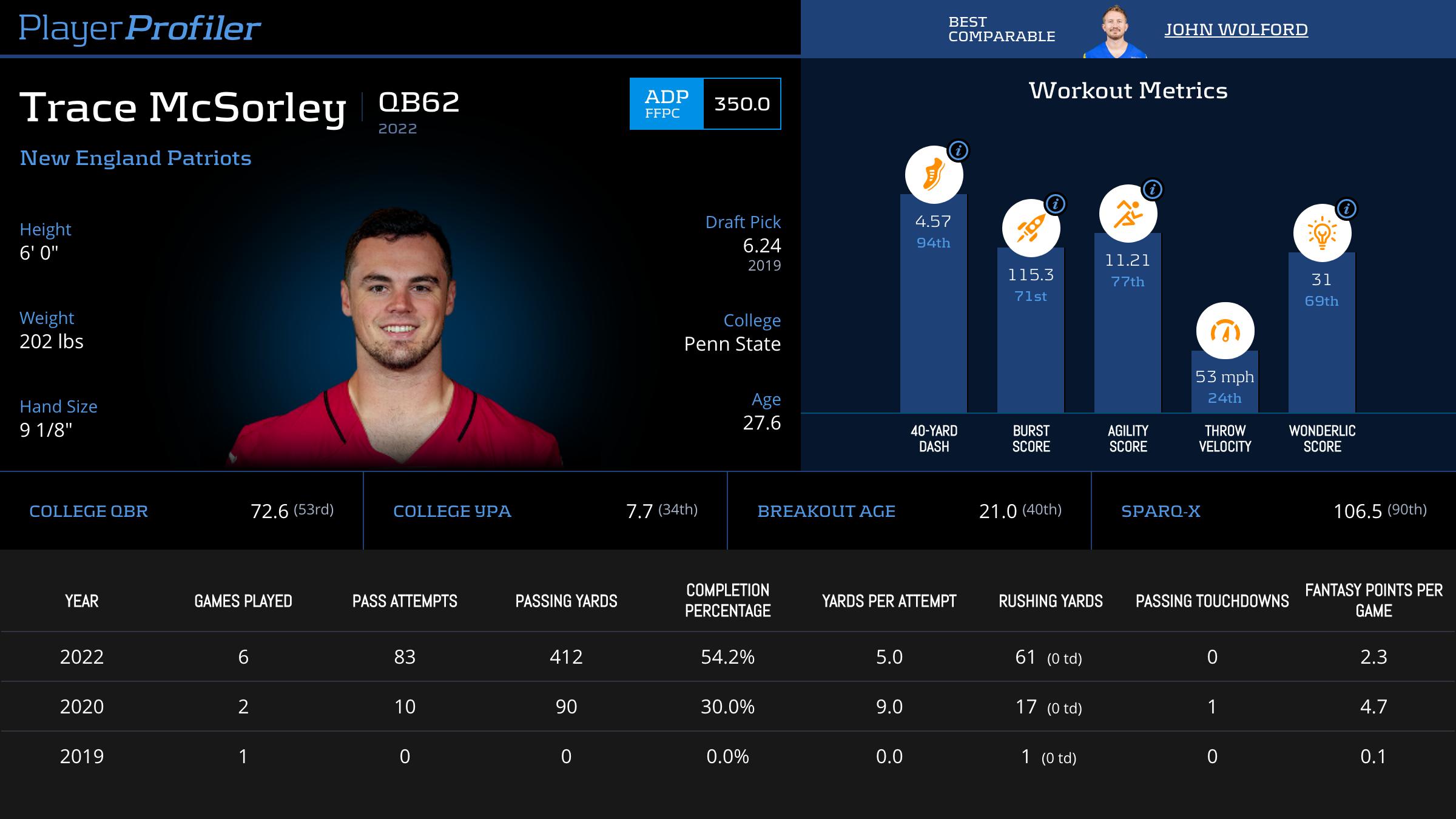 | 18 | SF | 9 | 66.7% | 29 (77 air) | 3.2 | 0 (1 int) | 13 | -- | 1.5 (#36) |