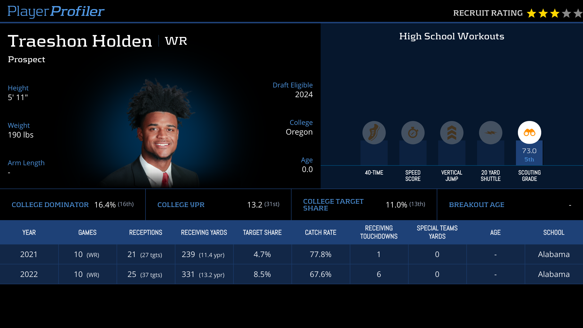 | Year Year | Games Games | Receptions Recs | Receiving Yards Rec Yds | Target Share Tgt Share | Catch Rate Catch Rate | Receiving Touchdowns Rec TDs | Special Teams Yards Special Teams | Age Age | School School |