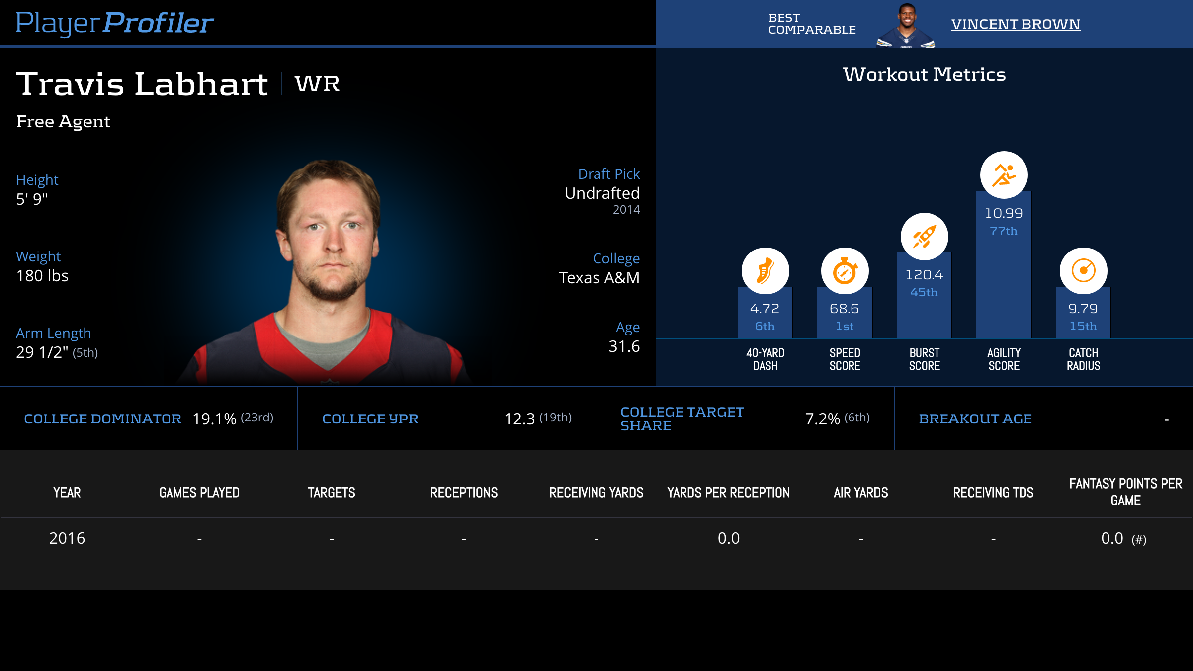| Year Year | Games Games | Receptions Recs | Receiving Yards Rec Yds | Target Share Tgt Share | Catch Rate Catch Rate | Receiving Touchdowns Rec TDs | Special Teams Yards Special Teams | Age Age | School School |