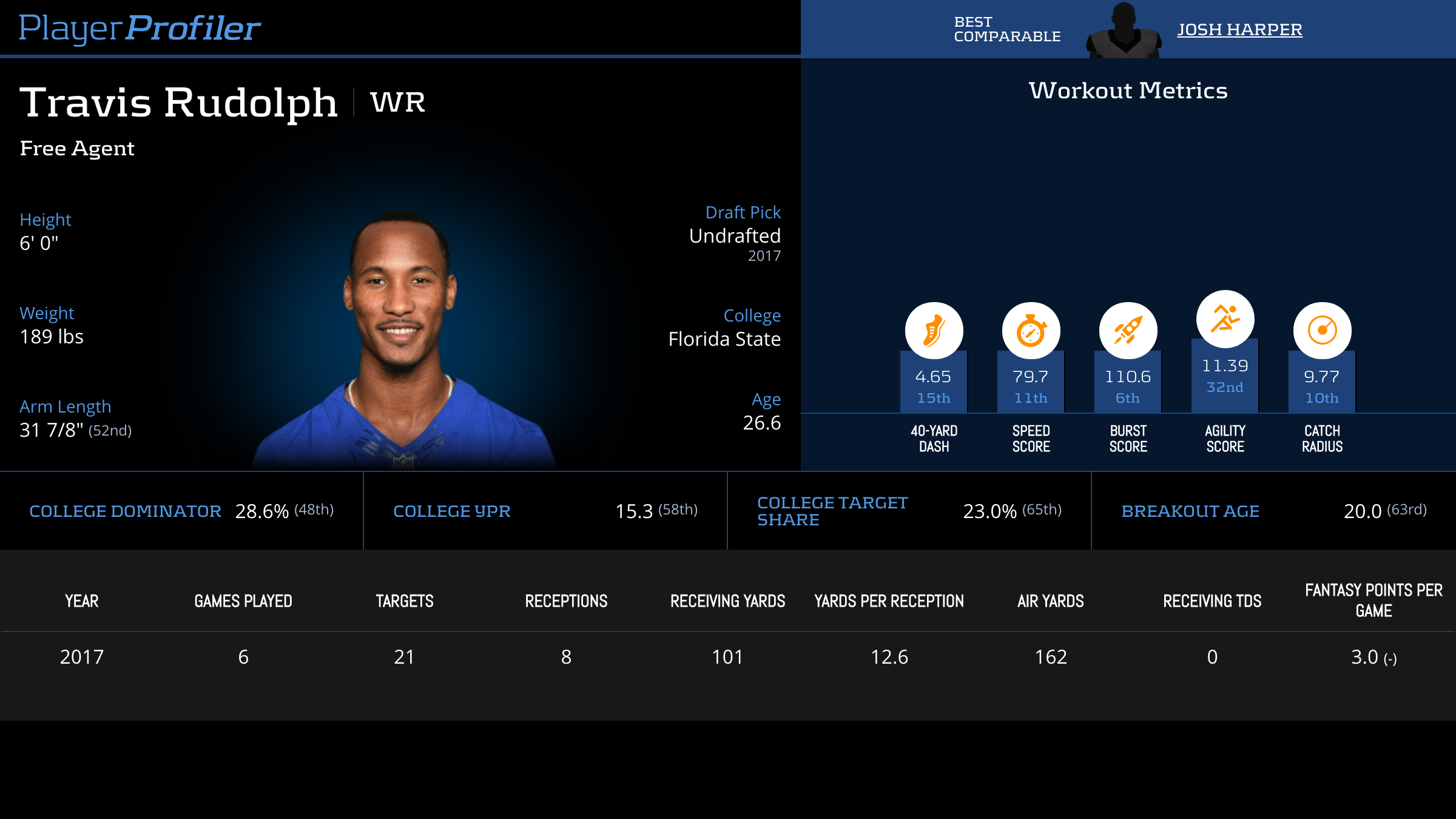 | Year Year | Games Games | Receptions Recs | Receiving Yards Rec Yds | Target Share Tgt Share | Catch Rate Catch Rate | Receiving Touchdowns Rec TDs | Special Teams Yards Special Teams | Age Age | School School |