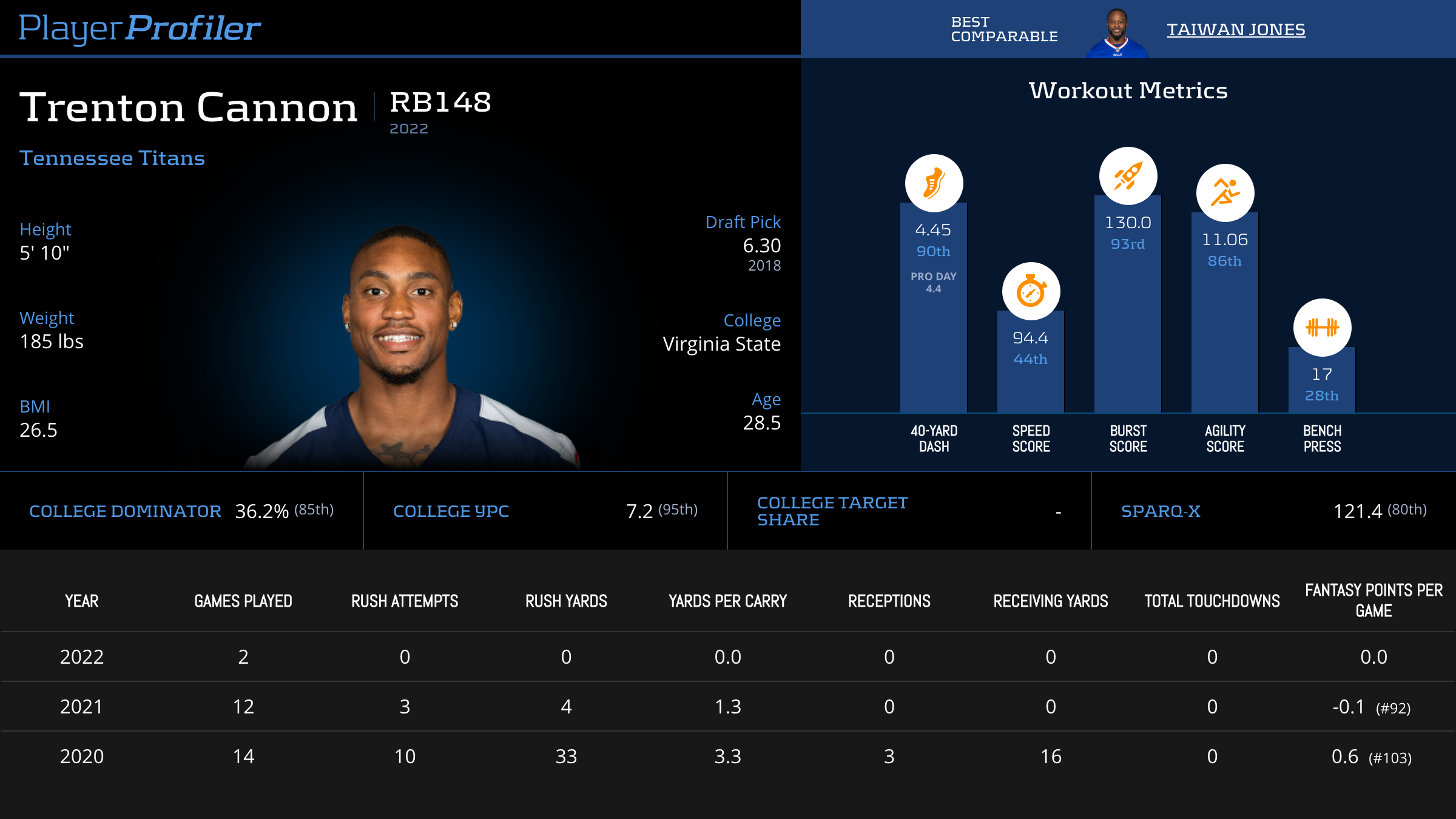 | Year Year | Games Games | Rush Attempts Rush Atts | Rushing Yards Rush Yrds | Total Touchdowns TDs | Receptions Rec | Receiving Yards Rec Yrds | Target Share Tgt Share | Age Age | School School |