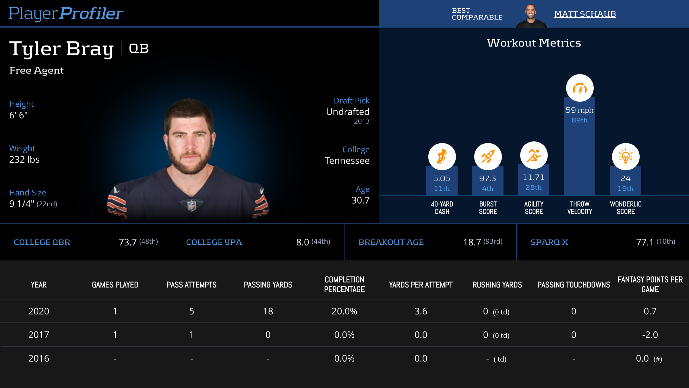 | Year Year | Games Games | Pass Attempts Pass Atts | Passing Yards Pass Yds | Yards Per Attempt YPA | Completion Percentage Comp % | Passing Touchdowns Pass TDs | Rushing Yards Rush Yds | Age Age | School School |