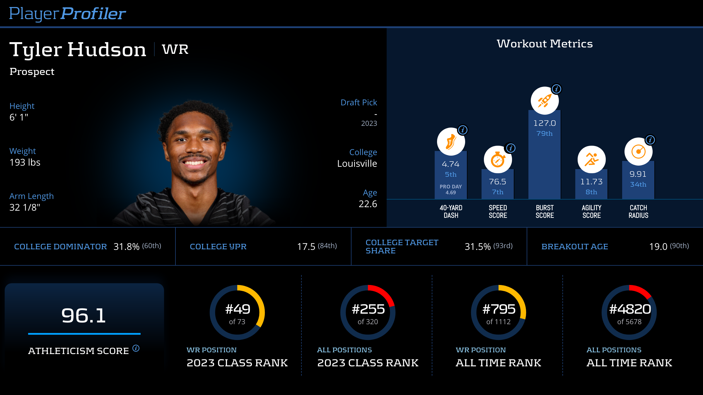 | Year Year | Games Games | Receptions Recs | Receiving Yards Rec Yds | Target Share Tgt Share | Catch Rate Catch Rate | Receiving Touchdowns Rec TDs | Special Teams Yards Special Teams | Age Age | School School |
