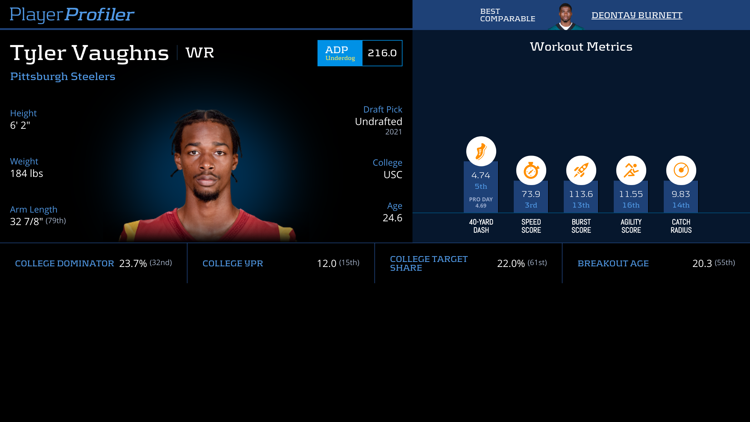 | Year Year | Games Games | Receptions Recs | Receiving Yards Rec Yds | Target Share Tgt Share | Catch Rate Catch Rate | Receiving Touchdowns Rec TDs | Special Teams Yards Special Teams | Age Age | School School |