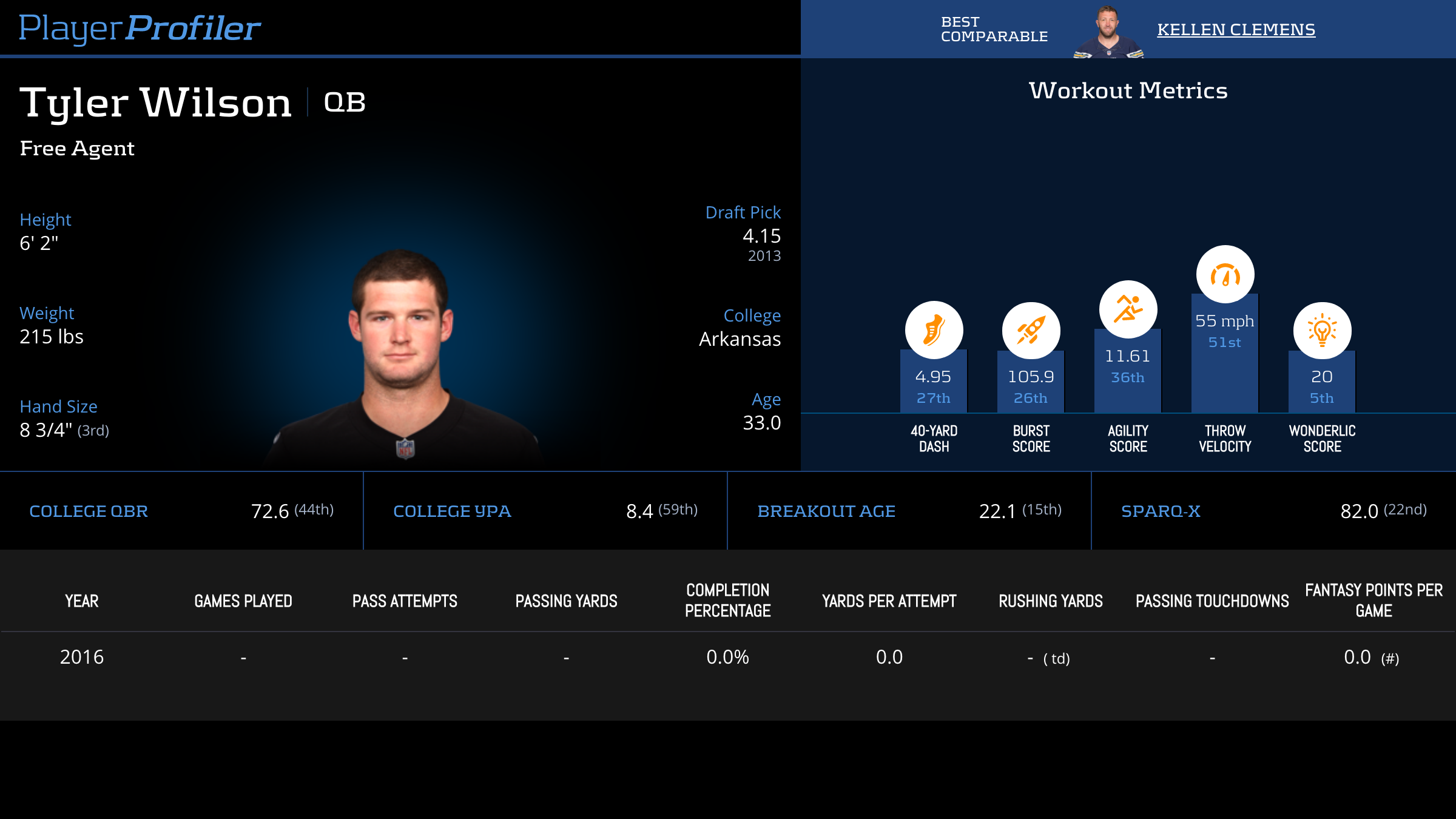 | Year Year | Games Games | Pass Attempts Pass Atts | Passing Yards Pass Yds | Yards Per Attempt YPA | Completion Percentage Comp % | Passing Touchdowns Pass TDs | Rushing Yards Rush Yds | Age Age | School School |