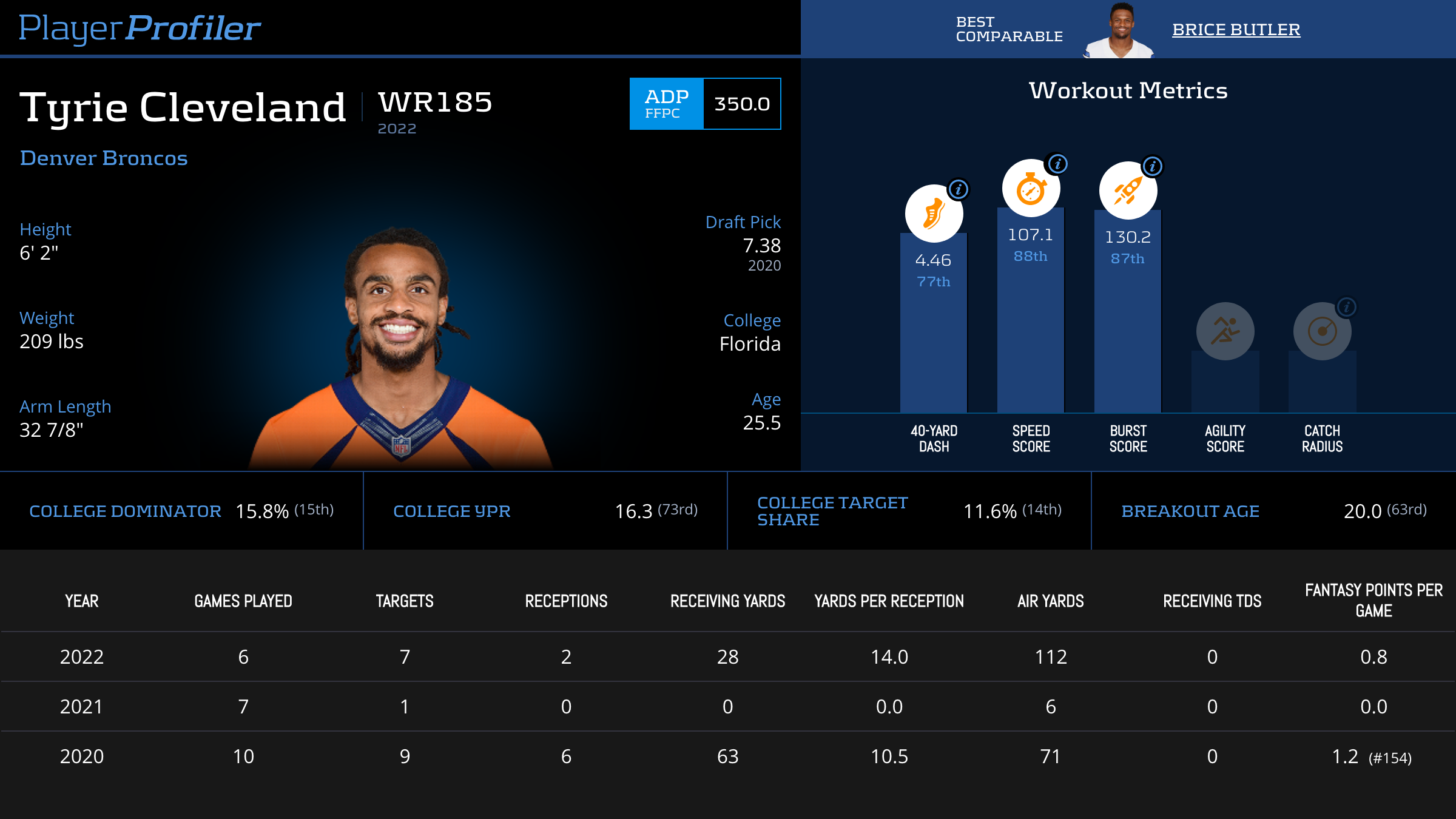 Box score statistics such as targets, yards, touchdowns, and fantasy points per target are updated the next day. Advanced stats and metrics are updated later in the week during the NFL season.