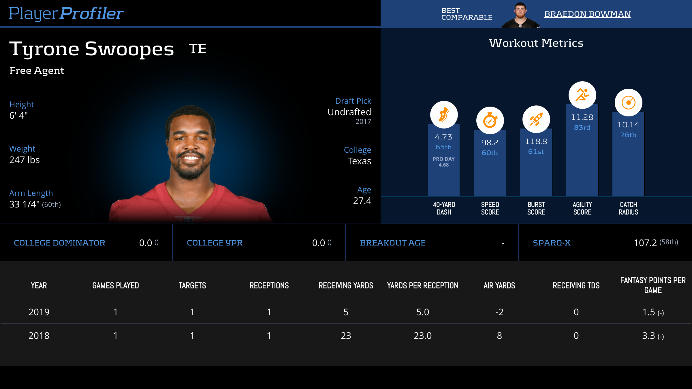 | Year Year | Games Games | Receptions Recs | Receiving Yards Rec Yds | Target Share Tgt Share | Catch Rate Catch Rate | Receiving Touchdowns Rec TDs | Special Teams Yards Special Teams | Age Age | School School |