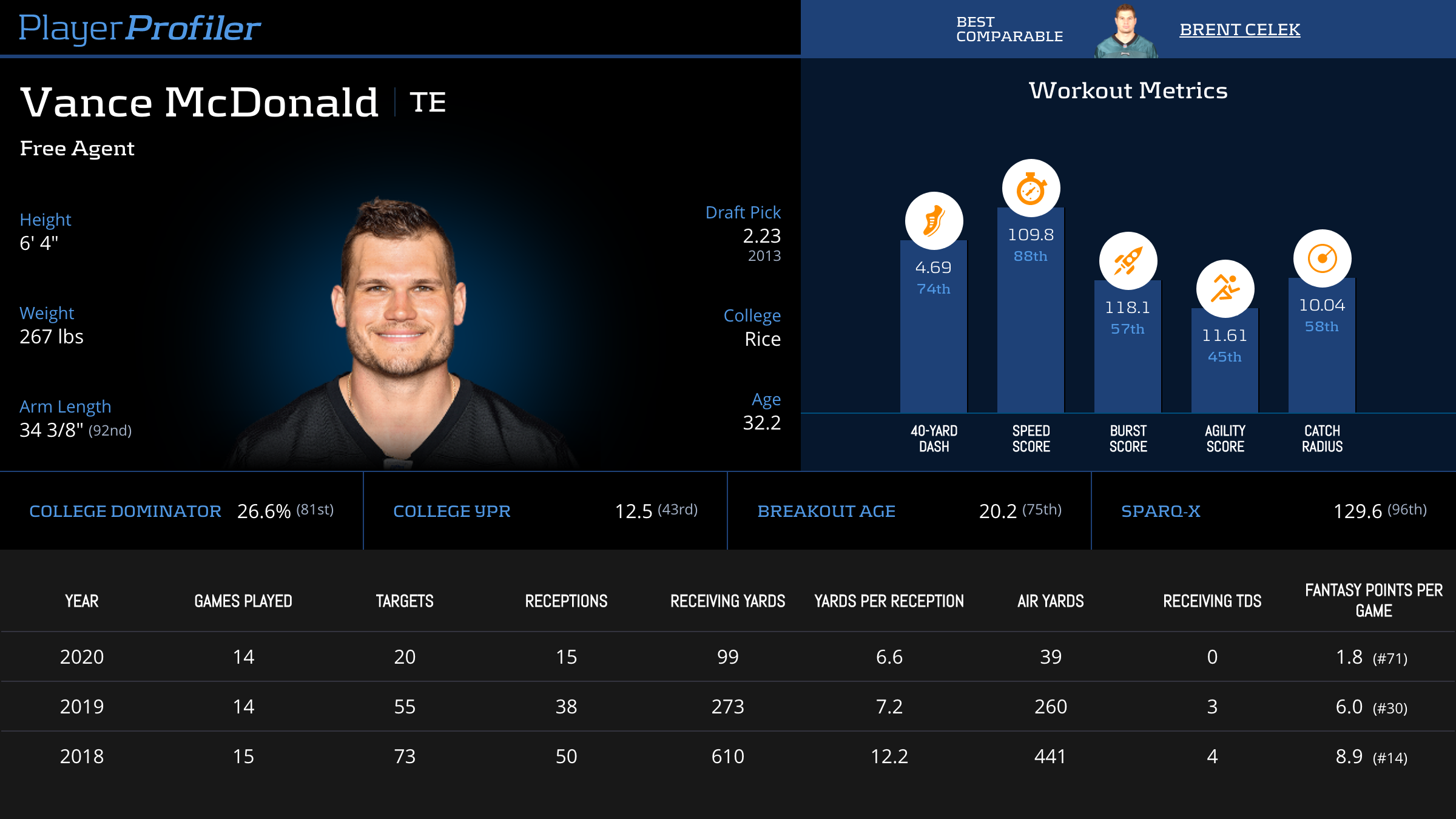 | Year Year | Games Games | Receptions Recs | Receiving Yards Rec Yds | Target Share Tgt Share | Catch Rate Catch Rate | Receiving Touchdowns Rec TDs | Special Teams Yards Special Teams | Age Age | School School |