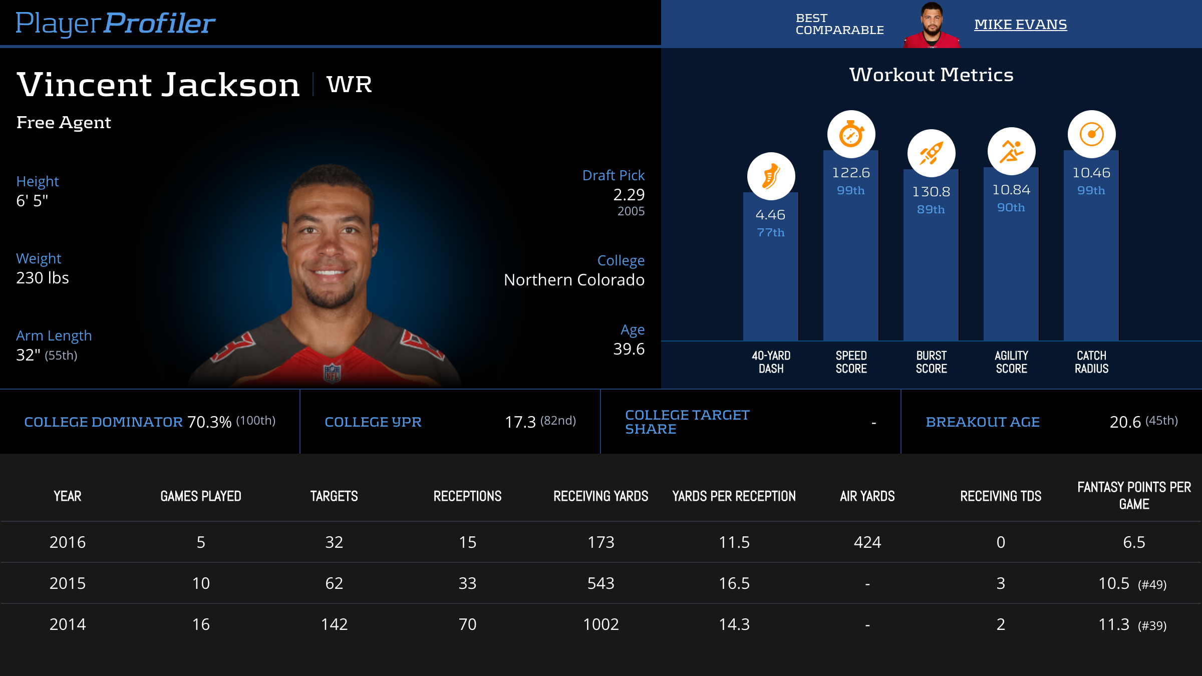 Value Over Stream: Valuation scheme calculates a player's fantasy pts/game over the average waiver wire replacement in standard fantasy league formats during either the current season (or previous year during the offseason) and adjusts for positional bust rates. VOS rank in parenthesis spans all positions, enabling player comparisons across QB's, RB's, WR's, and TE's.