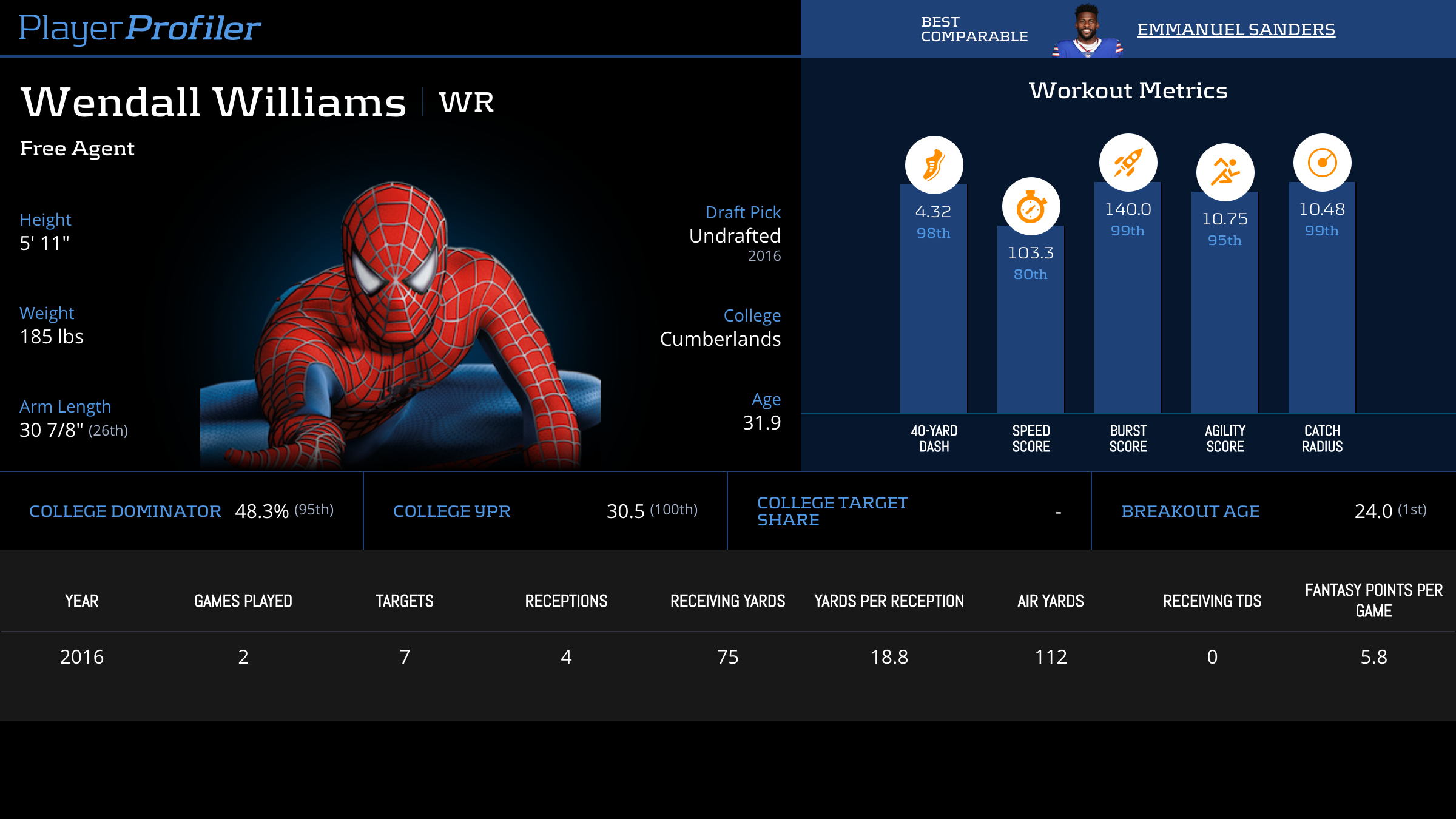 | Year Year | Games Games | Receptions Recs | Receiving Yards Rec Yds | Target Share Tgt Share | Catch Rate Catch Rate | Receiving Touchdowns Rec TDs | Special Teams Yards Special Teams | Age Age | School School |