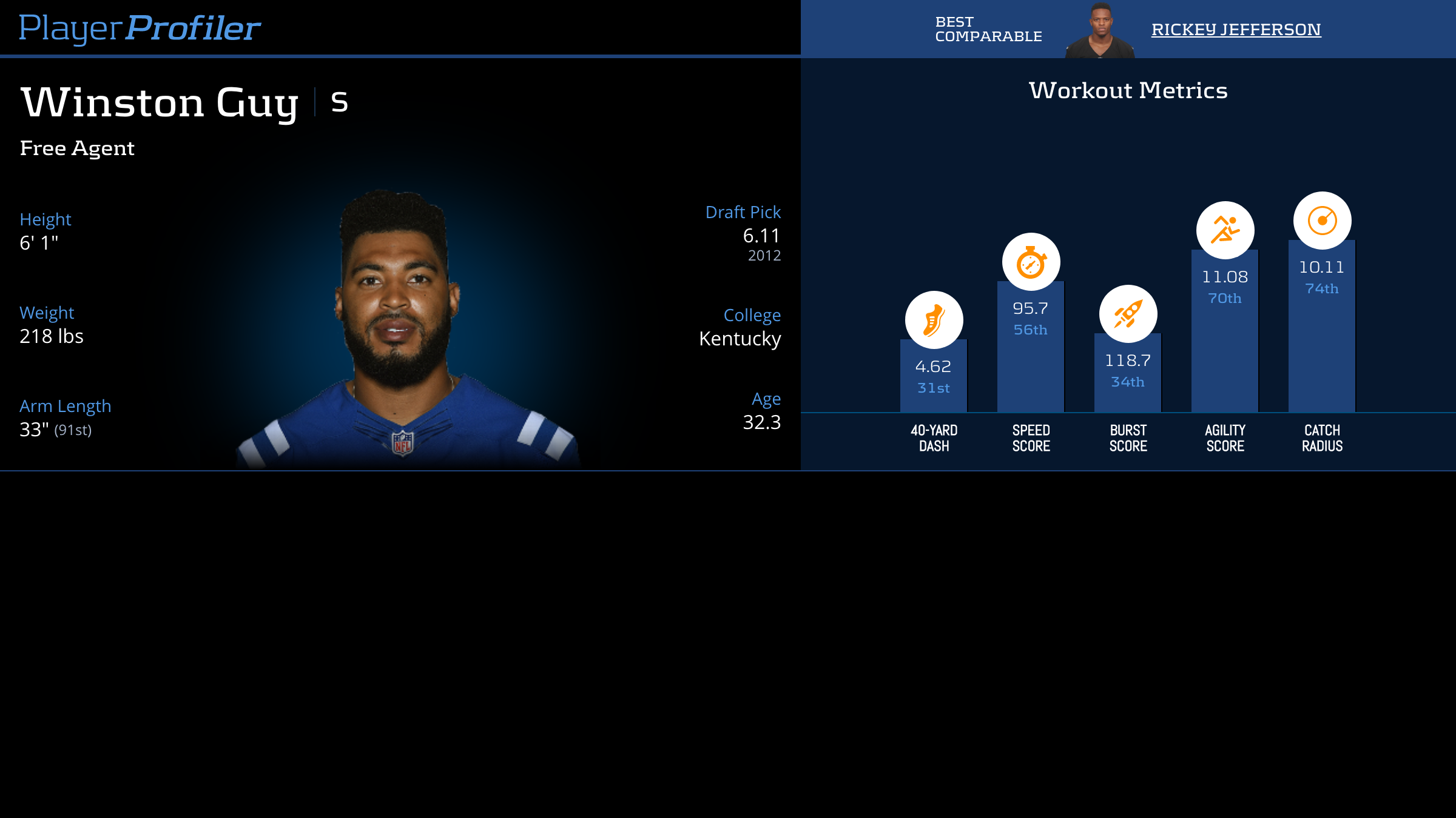 Value Over Stream: Valuation scheme calculates a player's fantasy pts/game over the average waiver wire replacement in standard fantasy league formats during either the current season (or previous year during the offseason) and adjusts for positional bust rates. VOS rank in parenthesis spans all positions, enabling player comparisons across QB's, RB's, WR's, and TE's.