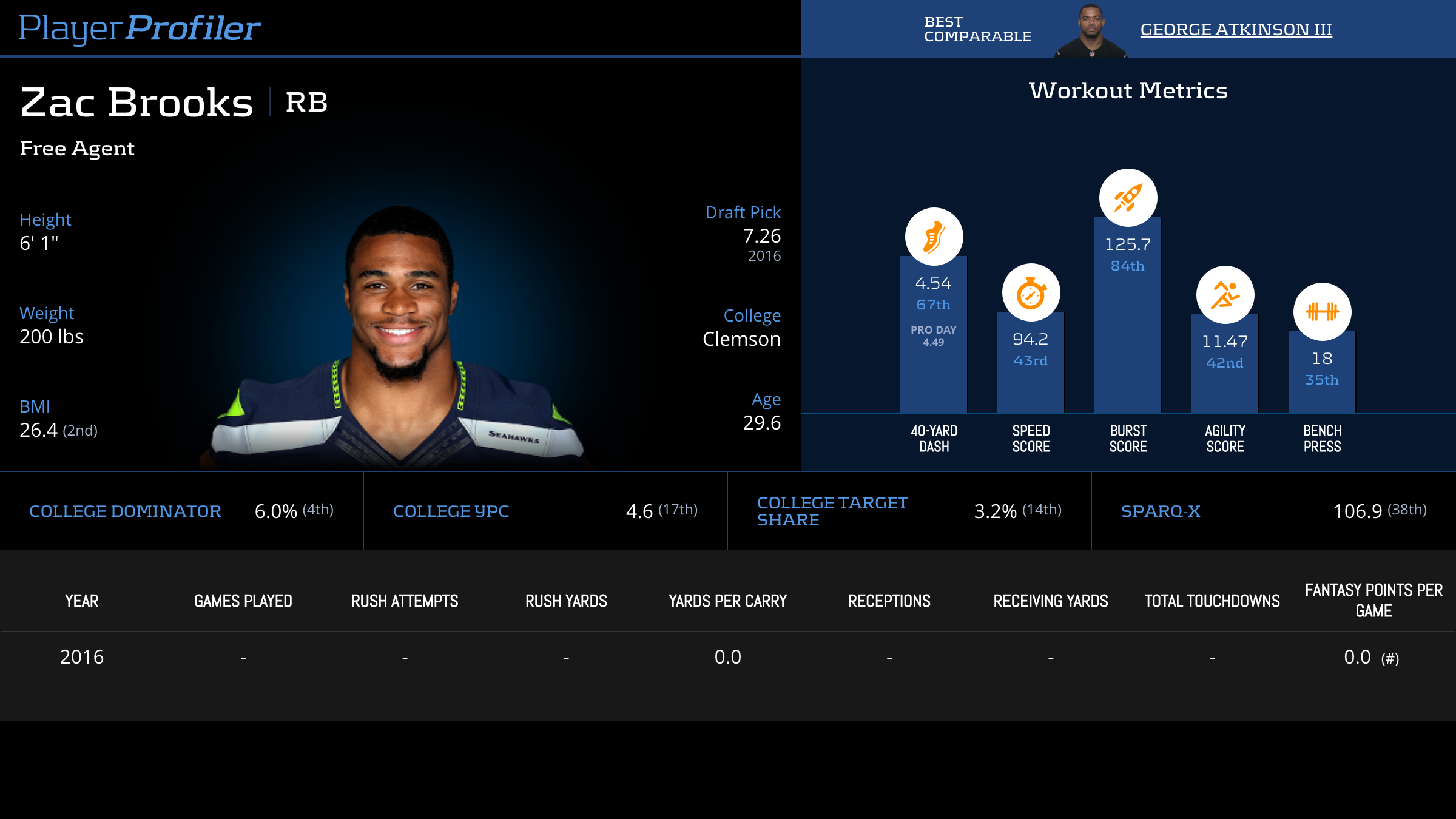 | Year Year | Games Games | Rush Attempts Rush Atts | Rushing Yards Rush Yrds | Total Touchdowns TDs | Receptions Rec | Receiving Yards Rec Yrds | Target Share Tgt Share | Age Age | School School |