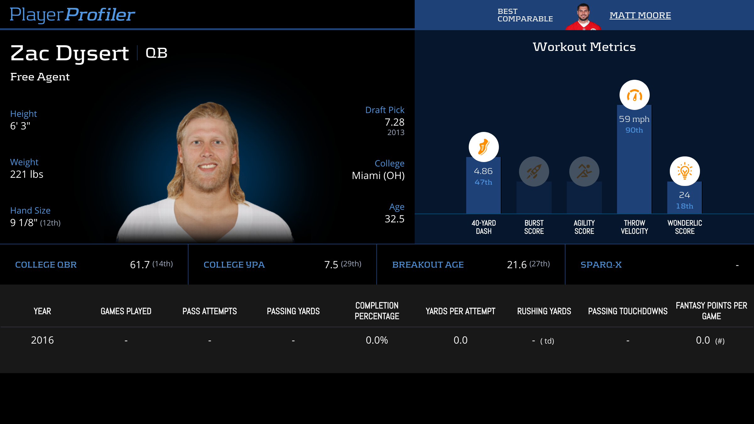 | Year Year | Games Games | Pass Attempts Pass Atts | Passing Yards Pass Yds | Yards Per Attempt YPA | Completion Percentage Comp % | Passing Touchdowns Pass TDs | Rushing Yards Rush Yds | Age Age | School School |