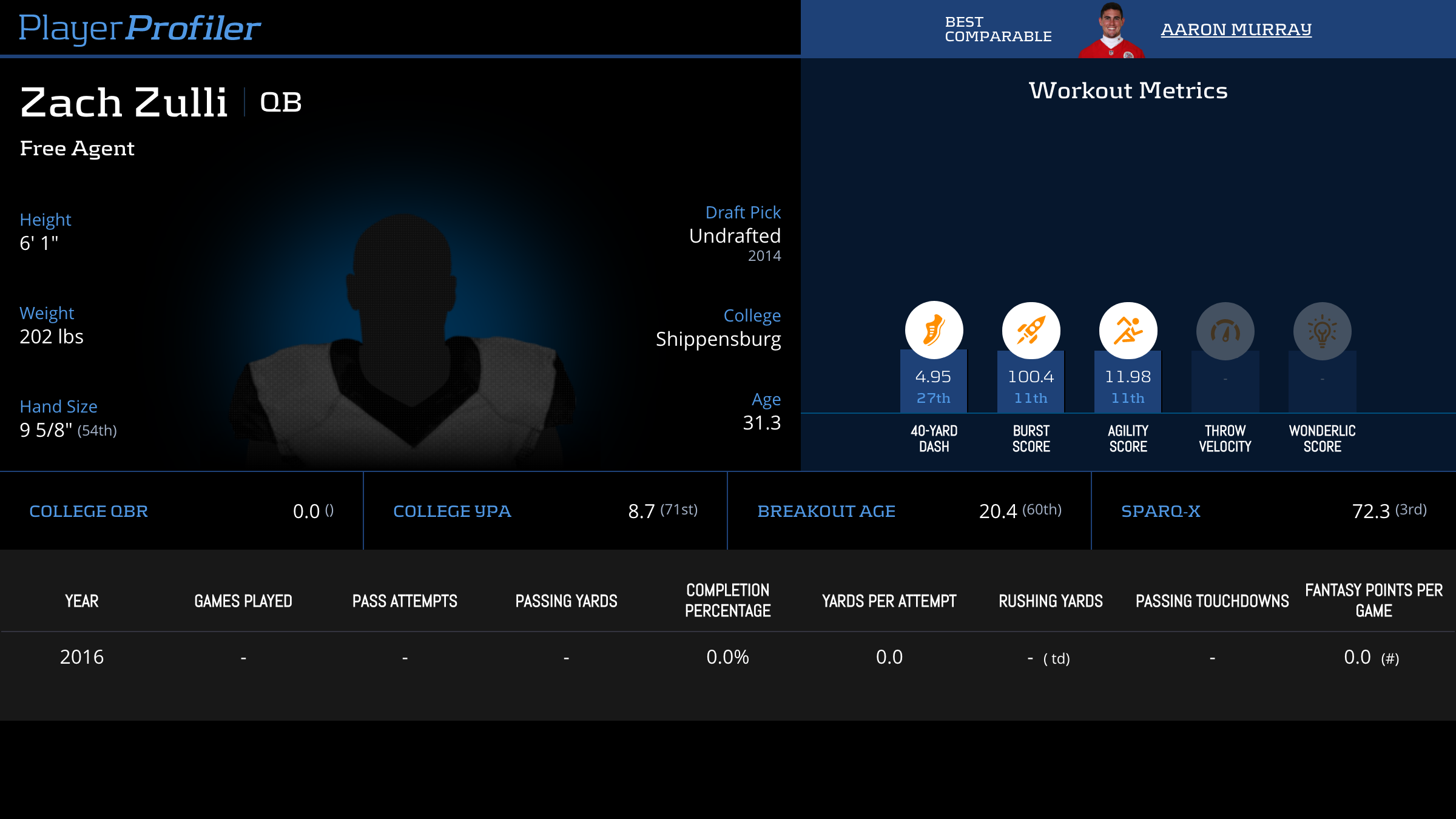 | Year Year | Games Games | Pass Attempts Pass Atts | Passing Yards Pass Yds | Yards Per Attempt YPA | Completion Percentage Comp % | Passing Touchdowns Pass TDs | Rushing Yards Rush Yds | Age Age | School School |