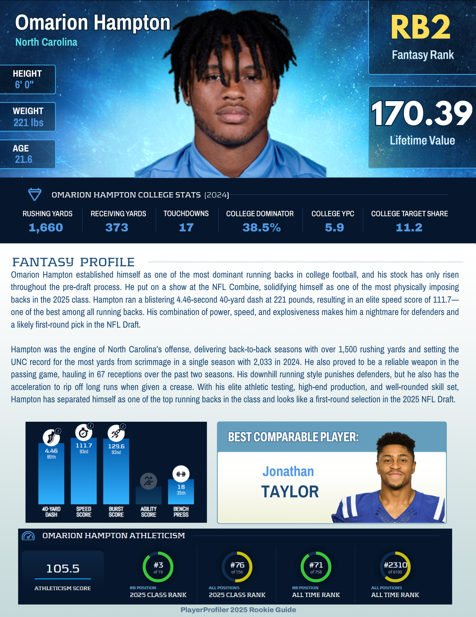 Whether you’re a Dynasty Manager chasing a championship, a Best Ball player hunting for hidden values, a Redraft gamer looking to stay ahead, or simply an NFL Draft fan, the 2025 PlayerProfiler Rookie Guide is the most complete rookie guide available — anywhere.