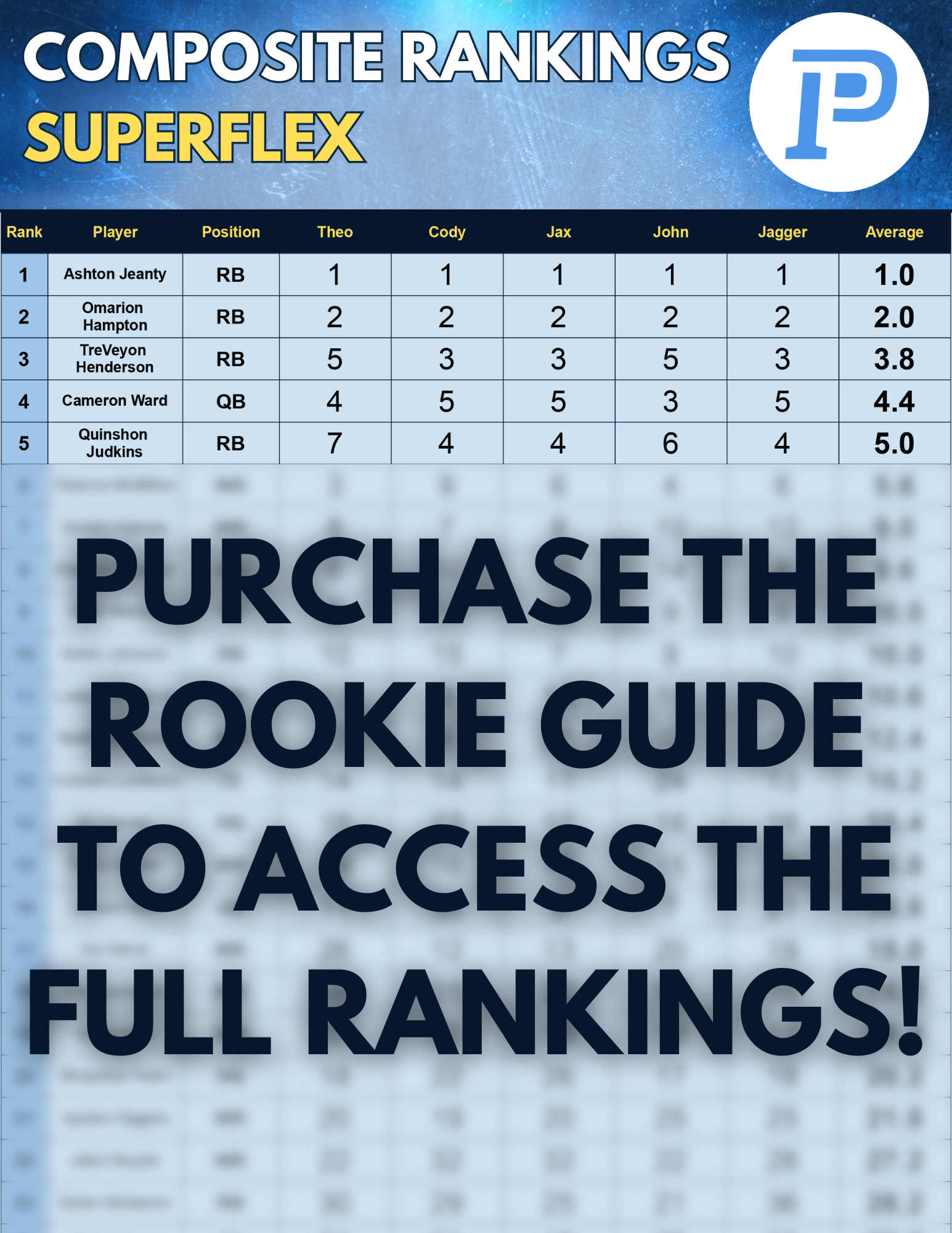 Featuring expert rankings and analysis from Cody Carpentier, Theo Gremminger, Jax Falcone of The Undroppables, Jagger May of FastDraft, and John Laub, the 2025 Rookie Guide is your one-stop shop for winning your rookie draft.